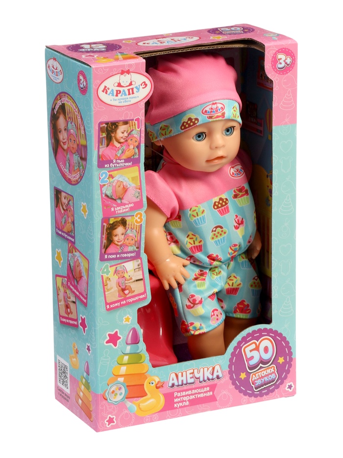 «Анечка» — это игровая кукла-малышка, с которой ребёнок может по-настоящему ухаживать и общаться. Она пьёт из бутылочки, ходит на горшок, закрывает глазки и озвучивает около 50 естественных детских звуков. Ребёнок пробует роль заботливого родителя, учится проявлять внимание и нежность, а игра становится понятной и близкой к реальной жизни. Кукла реагирует на действия: когда её укладывают, она закрывает глаза, когда поят из бутылочки — потом «писает», может смеяться, лепетать или хныкать. Звуки радости и недовольства помогают ребёнку лучше понимать эмоциональные реакции и вовлекаться в игру охотнее.