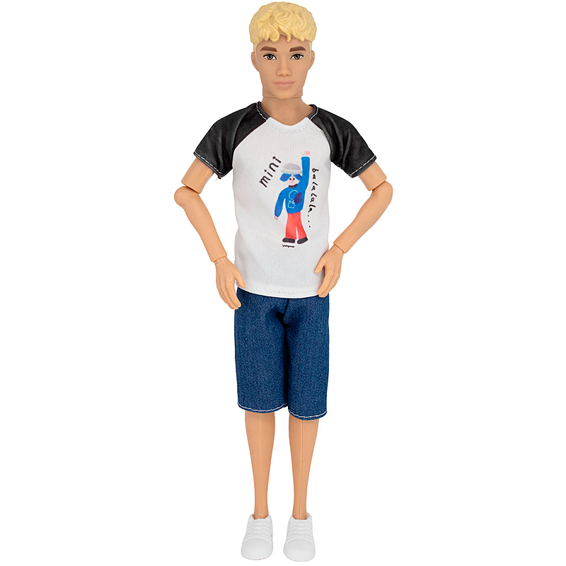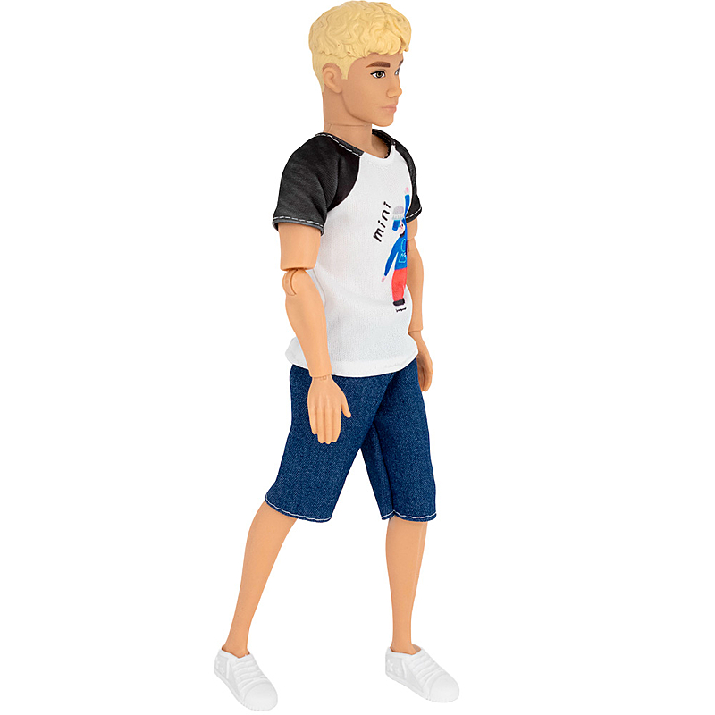 У Кена выразительные черты лица, аккуратная причёска и модный комплект одежды (белая футболка с ярким принтом, шорты и кроссовки). Играя с ним, девочки учатся заботиться, выражать свои чувства и общаться, а также моделировать интересные игровые ситуации и весело проводить время.