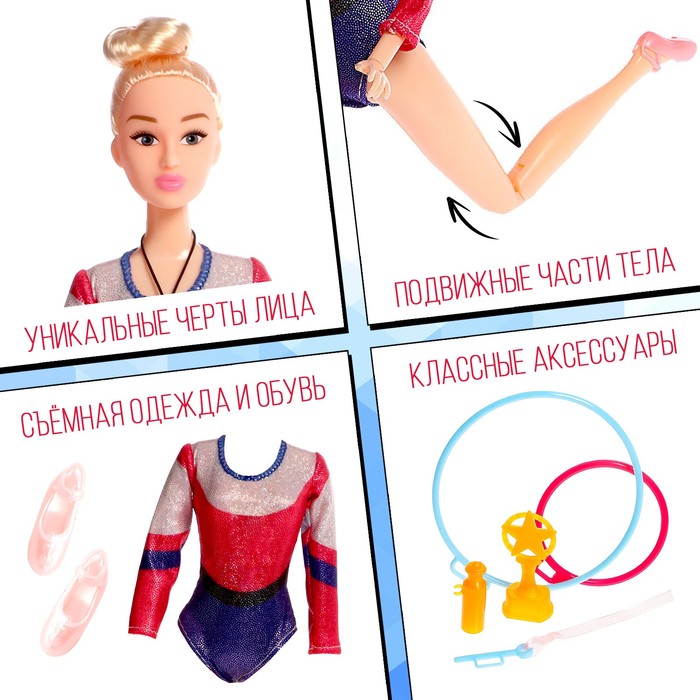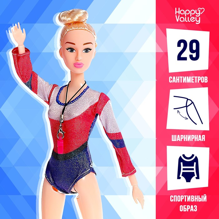 Девочка обожает играть в куклы и придумывать с ними разные истории? Порадуйте её красавицей-гимнасткой! В комплект с куклой входят 2 обруча и свисток.