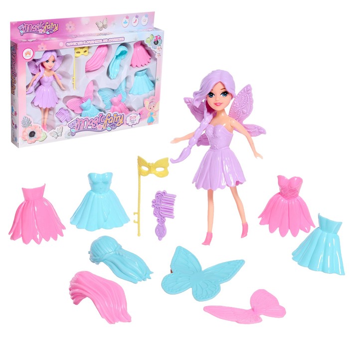 У сказочной феи длинные волосы, много платьев и аксессуаров. Ваша малышка может самостоятельно менять наряды, подбирать образы.