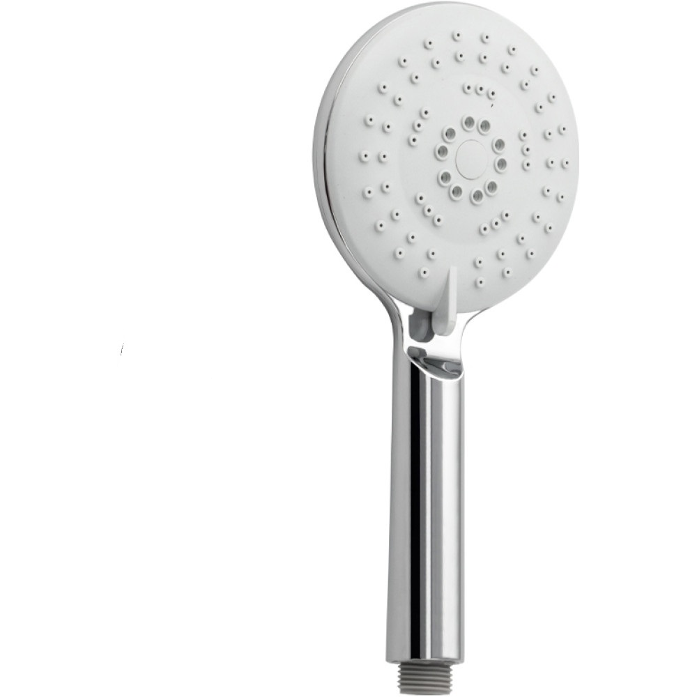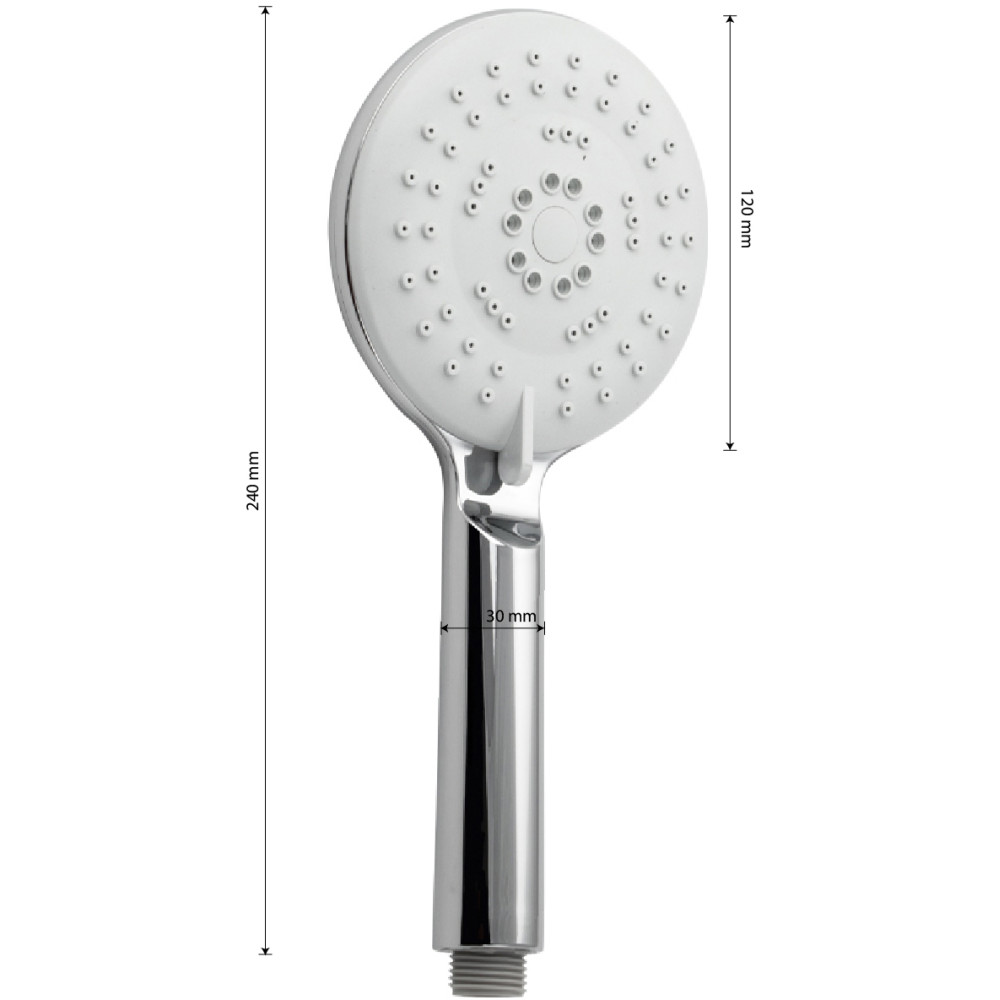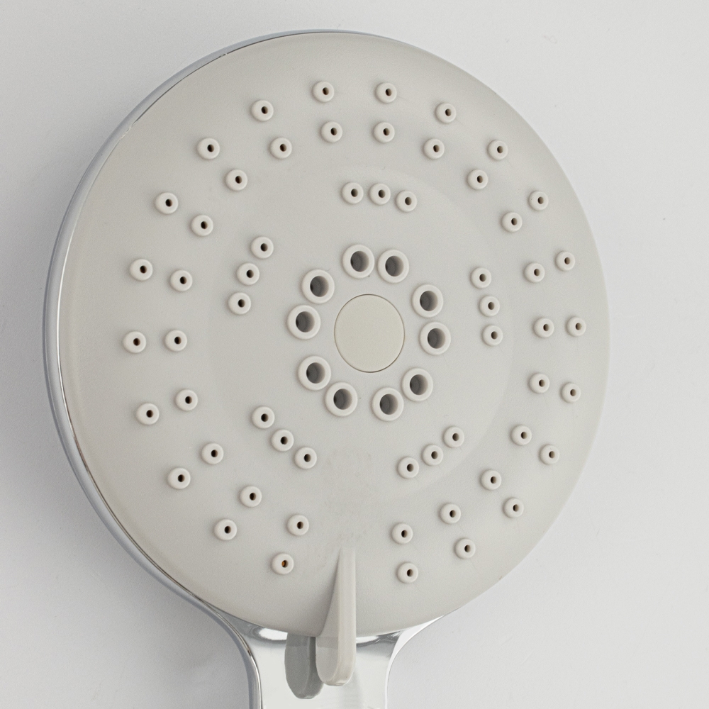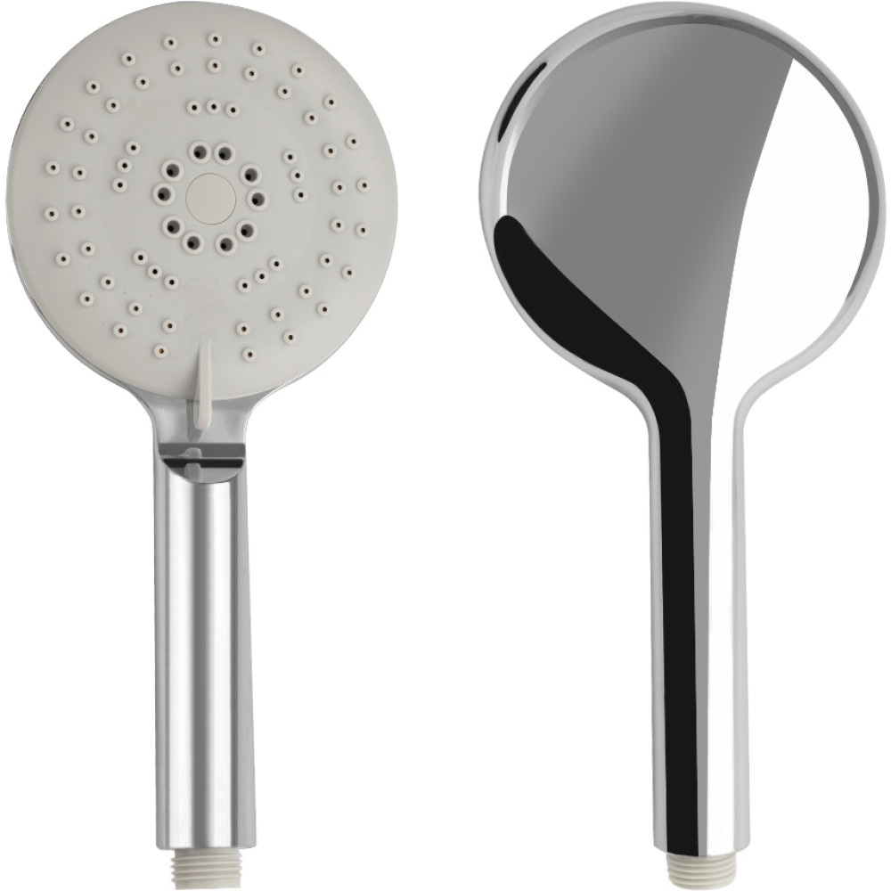 Душевая лейка круглая, отличается современным технологичным дизайном, высокой надежностью, долговечностью. Она изготовлена из влагостойкого пластика АБС и имеет декоративное покрытие цвета «хром», придающее устройству привлекательный вид и предохраняющее от агрессивного воздействия окружающей среды. Корпус отличается небольшим весом, что исключает повреждение напольной плитки или эмали ванны при случайном падении. Работает в трёх режимах с регулируемой интенсивностью: дождевая, обычная, струйный массаж. Ухаживать за душевой лейкой легко. Глянцевую поверхность достаточно протереть мягкой салфеткой, она в течение долгого времени не потеряет своего блеска. Система помогает мгновенно очистить силиконовые форсунки душевой лейки от известкового налета и загрязнения.
