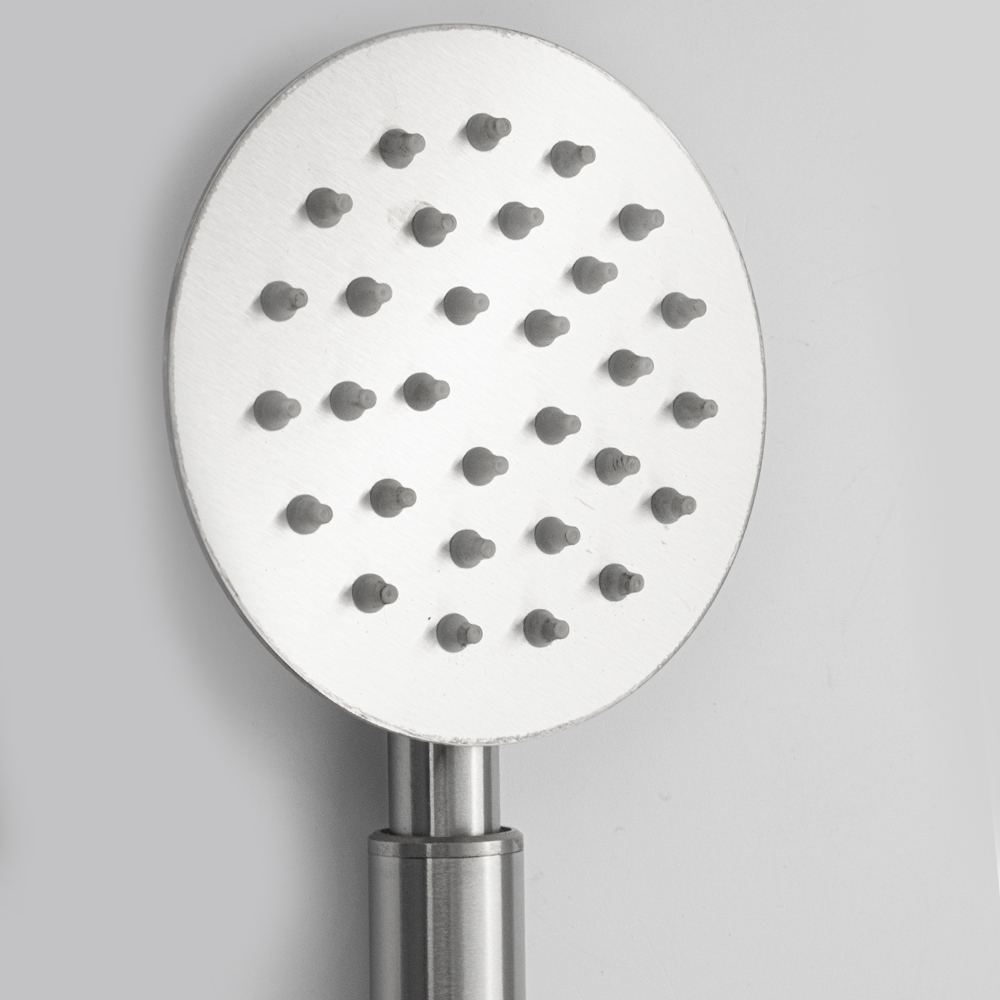 Душевая лейка антивандальная, с возможностью легкой очистки, отличается современным технологичным дизайном, высокой надежностью, долговечностью. Она изготовлена из нержавеющей стали марки SUS 304 и имеет матовое покрытие, придающее устройству привлекательный вид и предохраняющее от агрессивного воздействия окружающей среды. Корпус отличается небольшим весом, что исключает повреждение напольной плитки или эмали ванны при случайном падении. Работает в режиме тончайшего распыления воды. Ухаживать за душевой лейкой легко. Система помогает мгновенно очистить силиконовые форсунки душевой лейки от известкового налета и загрязнения. Поверхность достаточно протереть мягкой салфеткой, она в течение долгого времени не потеряет своего внешнего вида.
