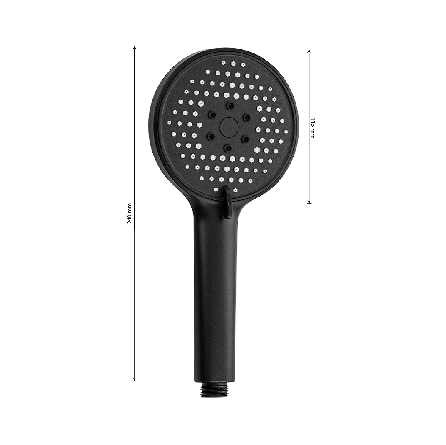 Душевая лейка массажная круглая, отличается современным технологичным дизайном, высокой надежностью, долговечностью. Она изготовлена из влагостойкого пластика АБС и имеет декоративное покрытие чёрного цвета, придающее устройству привлекательный вид и предохраняющее от агрессивного воздействия окружающей среды. Корпус отличается небольшим весом, что исключает повреждение напольной плитки или эмали ванны при случайном падении. Работает в двух режимах с регулируемой интенсивностью: обычная, струйный массаж. Ухаживать за душевой лейкой легко. Матовую поверхность достаточно протереть мягкой салфеткой, она в течение долгого времени не потеряет своего вида. Система помогает мгновенно очистить силиконовые форсунки душевой лейки от известкового налета и загрязнения.