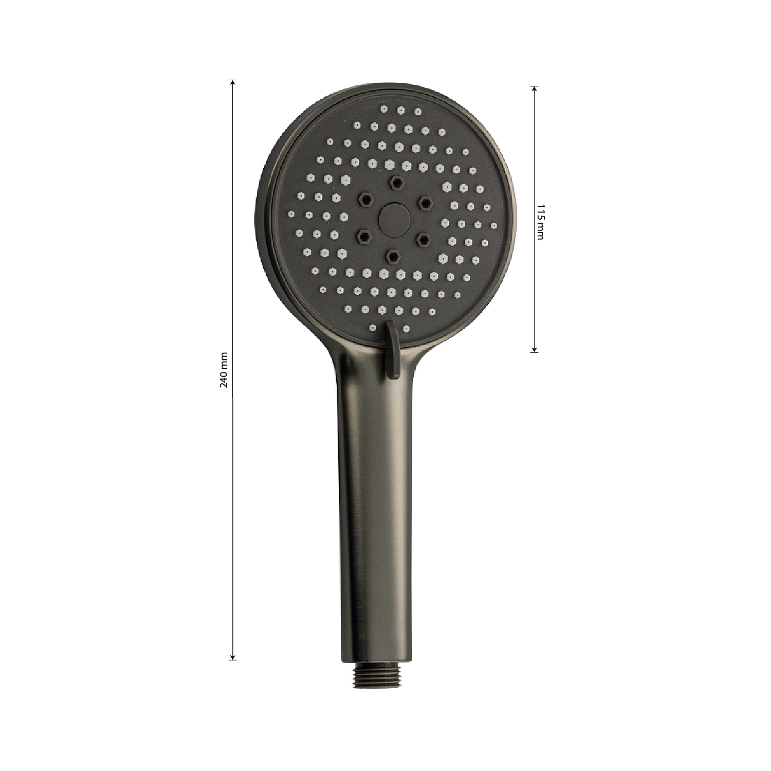 Душевая лейка массажная круглая, отличается современным технологичным дизайном, высокой надежностью, долговечностью. Она изготовлена из влагостойкого пластика АБС и имеет декоративное покрытие графитового цвета, придающее устройству привлекательный вид и предохраняющее от агрессивного воздействия окружающей среды. Корпус отличается небольшим весом, что исключает повреждение напольной плитки или эмали ванны при случайном падении. Работает в двух режимах с регулируемой интенсивностью: обычная, струйный массаж. Ухаживать за душевой лейкой легко. Матовую поверхность достаточно протереть мягкой салфеткой, она в течение долгого времени не потеряет своего вида. Система помогает мгновенно очистить силиконовые форсунки душевой лейки от известкового налета и загрязнения.
