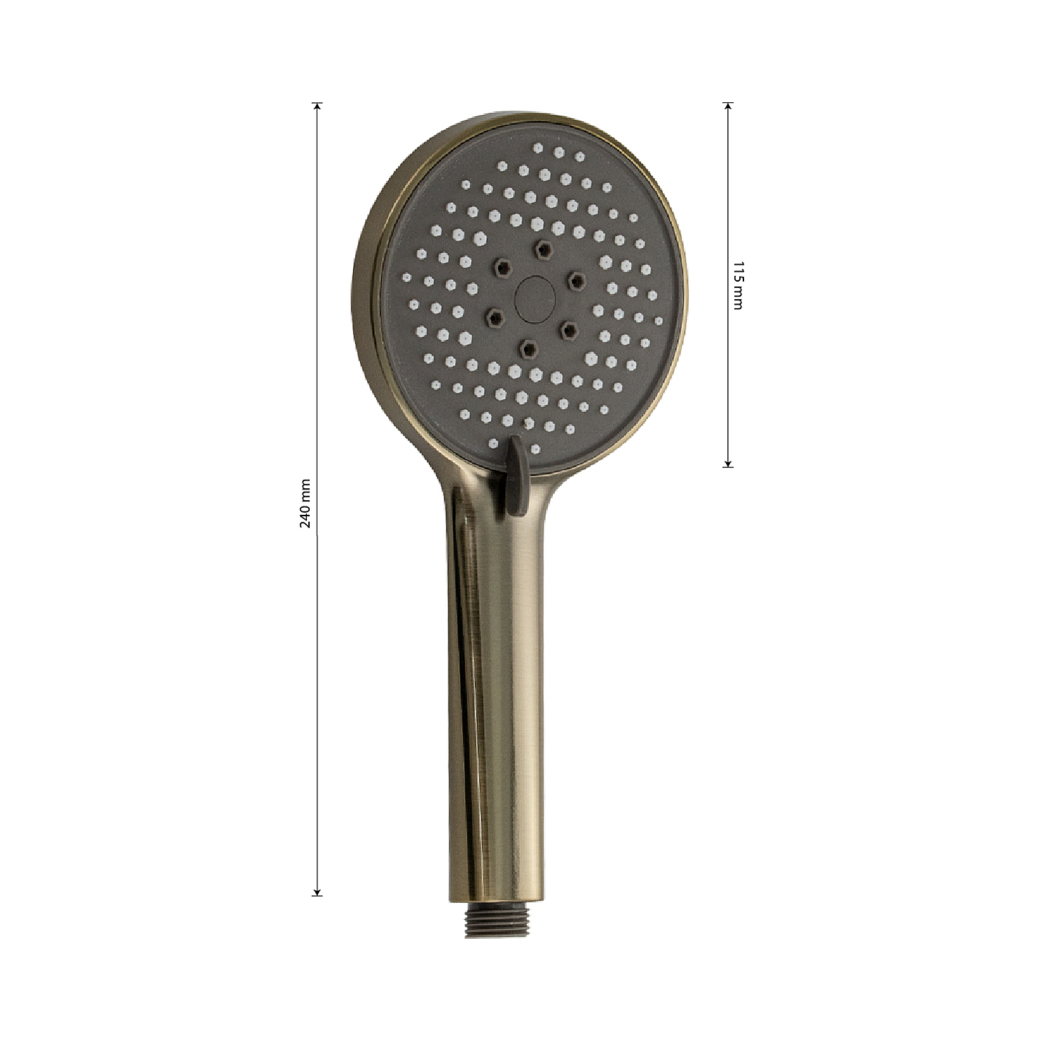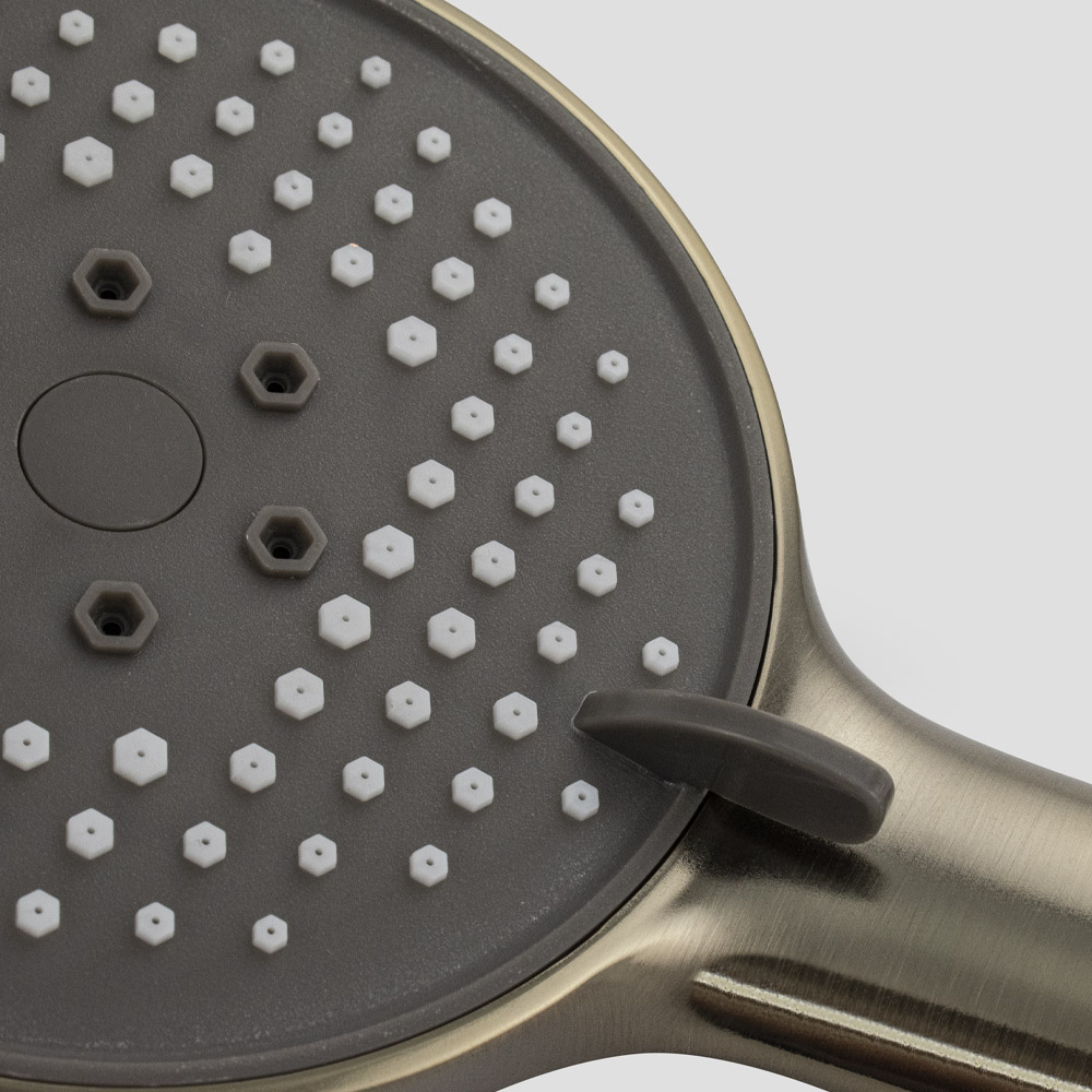 Душевая лейка массажная круглая, отличается современным технологичным дизайном, высокой надежностью, долговечностью. Она изготовлена из влагостойкого пластика АБС и имеет декоративное покрытие бронзового цвета, придающее устройству привлекательный вид и предохраняющее от агрессивного воздействия окружающей среды. Корпус отличается небольшим весом, что исключает повреждение напольной плитки или эмали ванны при случайном падении. Работает в двух режимах с регулируемой интенсивностью: обычная, струйный массаж. Ухаживать за душевой лейкой легко. Матовую поверхность достаточно протереть мягкой салфеткой, она в течение долгого времени не потеряет своего вида. Система помогает мгновенно очистить силиконовые форсунки душевой лейки от известкового налета и загрязнения.