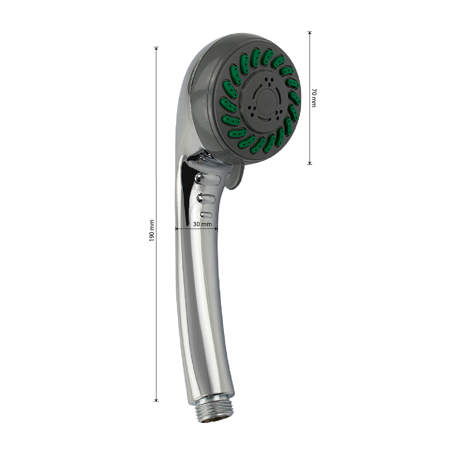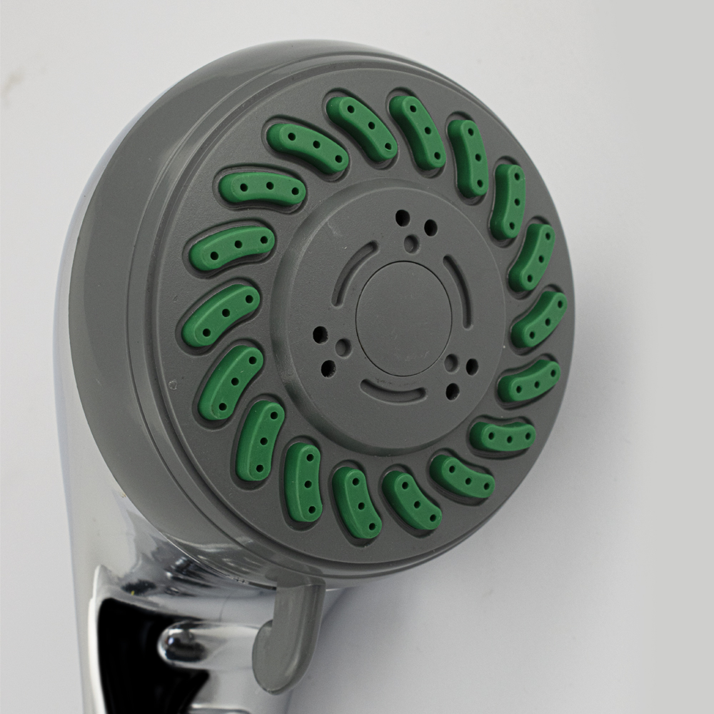 Душевая лейка отличается современным технологичным дизайном, высокой надежностью, долговечностью. Она изготовлена из влагостойкого пластика АБС и имеет декоративное покрытие цвета «хром», придающее устройству привлекательный вид и предохраняющее от агрессивного воздействия окружающей среды. Корпус отличается небольшим весом, что исключает повреждение напольной плитки или эмали ванны при случайном падении. Работает в двух режимах с регулируемой интенсивностью: обычная, струйный массаж. Ухаживать за душевой лейкой легко. Глянцевую поверхность достаточно протереть мягкой салфеткой, она в течение долгого времени не потеряет своего блеска. Система помогает мгновенно очистить силиконовые форсунки душевой лейки от известкового налета и загрязнения.