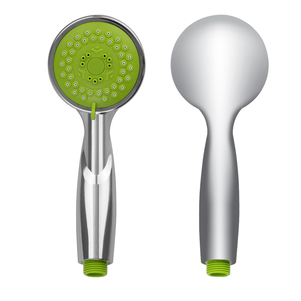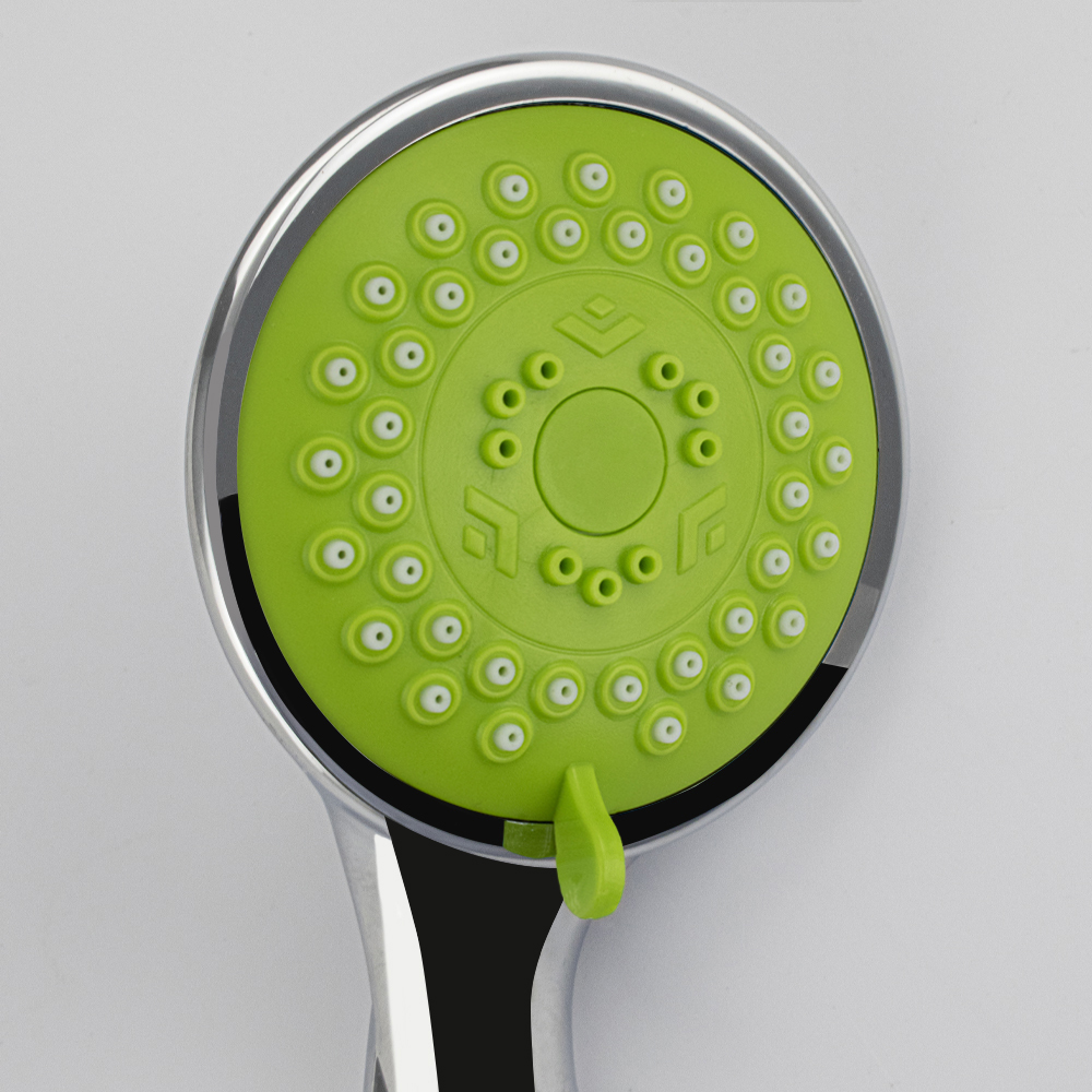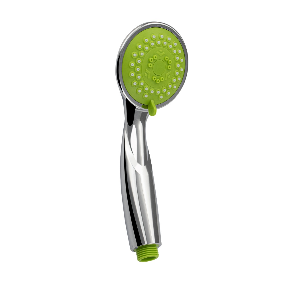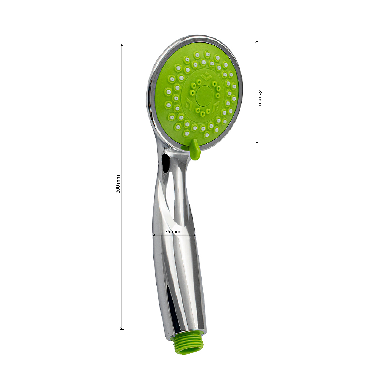 Душевая лейка с зелёной вставкой отличается современным технологичным дизайном, высокой надежностью, долговечностью. Она изготовлена из влагостойкого пластика АБС и имеет декоративное покрытие цвета «хром», придающее устройству привлекательный вид и предохраняющее от агрессивного воздействия окружающей среды. Корпус отличается небольшим весом, что исключает повреждение напольной плитки или эмали ванны при случайном падении. Работает в трех режимах с регулируемой интенсивностью: обычная, струйный массаж, распыление. Ухаживать за душевой лейкой легко. Глянцевую поверхность достаточно протереть мягкой салфеткой, она в течение долгого времени не потеряет своего блеска. Система помогает мгновенно очистить силиконовые форсунки душевой лейки от известкового налета и загрязнения.