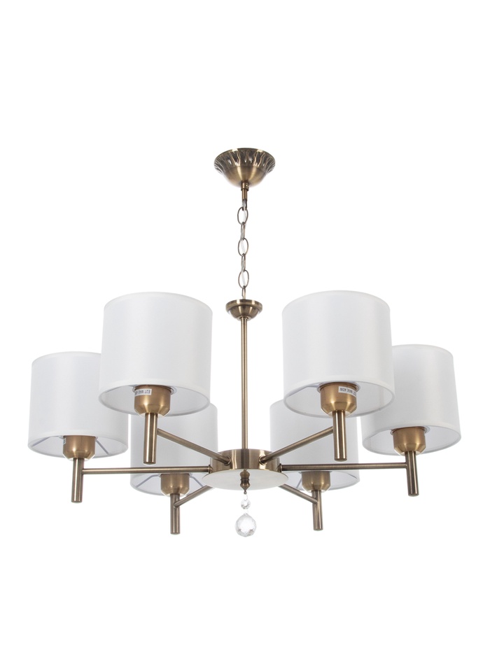 Подвесная люстра в бронзовом исполнении с шестью абажурами — выразительное решение для интерьеров в стиле неоклассика. Металлическое основание в тёплом оттенке бронзы гармонично сочетается с белыми текстильными плафонами цилиндрической формы, создавая мягкий, рассеянный свет и уютную атмосферу. Подвес на цепи придаёт конструкции визуальную лёгкость и позволяет органично вписать модель в помещения с различной высотой потолков.