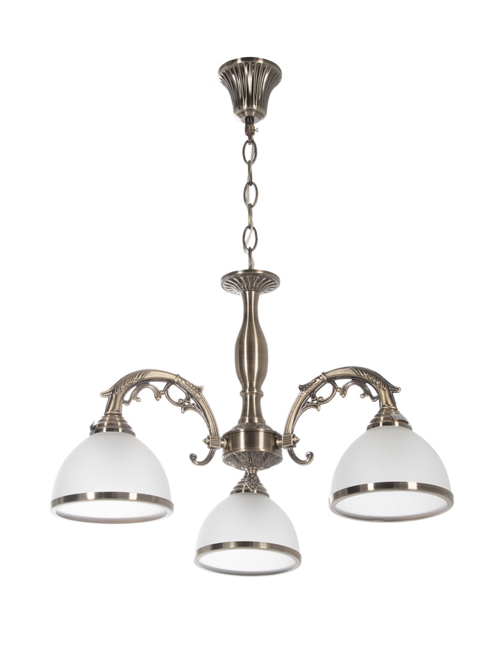 Потолочная люстра с тремя источниками света и благородной бронзовой отделкой объединяет в себе стиль классики и продуманную функциональность, создавая уютную атмосферу в жилых помещениях. Эффектная игра белых стеклянных плафонов и металлического основания подчёркивает интерьер и делает светильник заметным, но элегантным элементом декора. Высота подвеса регулируется в диапазоне от 32 до 70 см, что даёт гибкость при установке в помещениях с разной высотой потолков.