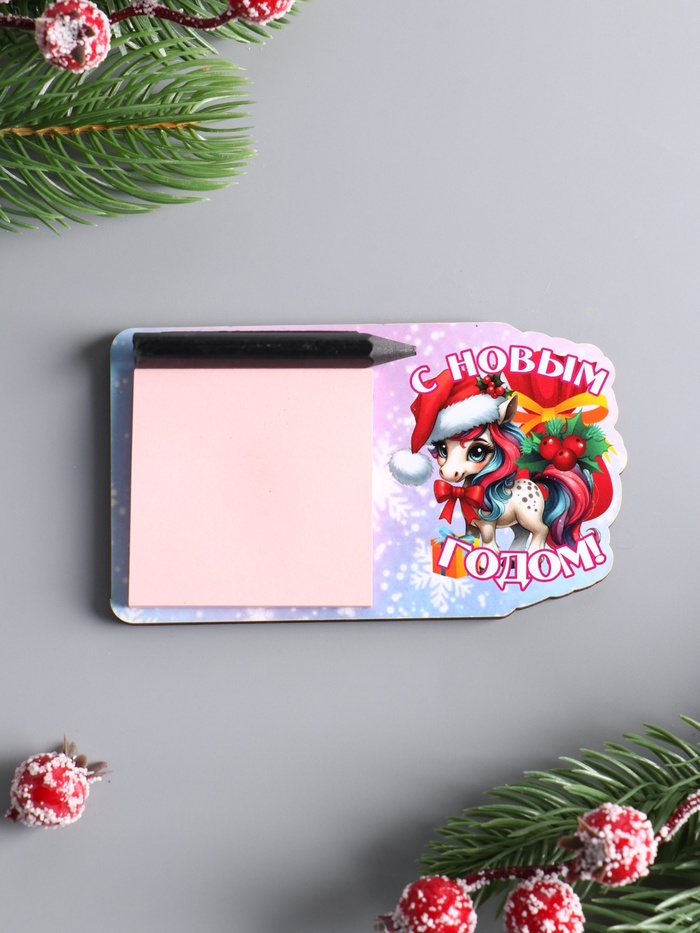 Этот новогодний магнит с блоком для записок станет тёплым и функциональным дополнением к праздничному декору. Он напоминает о приближающемся волшебстве и помогает организовать важные мелочи. Символ наступающего года принесёт в дом удачу и станет стильным акцентом на кухне или в офисе.