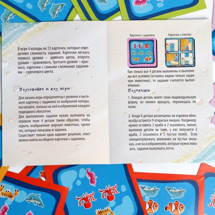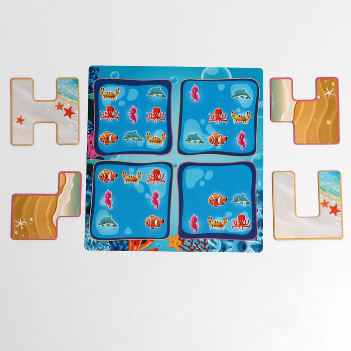 Для начала определитесь с уровнем игры. Это легко сделать, посмотрев на цвет карточек: зеленые – простые, сиреневые – самые сложные. А теперь приготовьтесь, ведь начинается игра! Итак, Вы – владелец подводной фермы. Игровое поле – магнитная доска. У Вас есть четыре детали разной формы. Задача – расположить их на поле так, чтобы остались только морские жители, изображенные на карточке. Попробуйте решить головоломку!