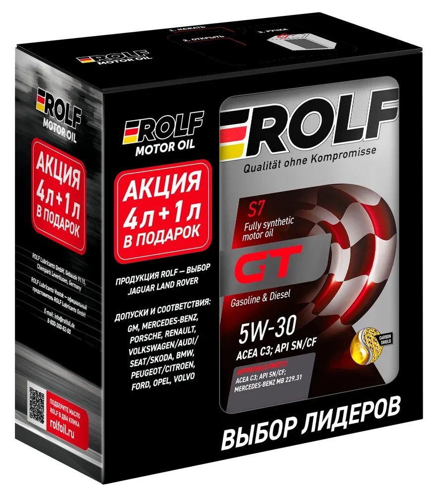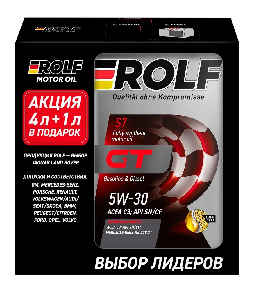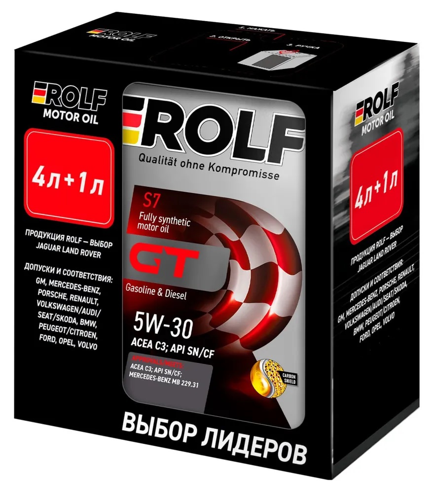Акция! 1 литр в подарок! Синтетическое моторное масло Rolf GT SAE 5W-30 ACEA C3 API SN/CF с технологией Carbon Shield содержит уникальный комплекс детергентов, повышающий способность масла предотвращать образование отложений, обладает повышенной стойкостью к окислению, тем самым обеспечивая превосходную защиту двигателя от износа и увеличение интервалов замены масла, способствует быстрому и легкому запуску двигателя при низких температурах. Совместимо с современными системами снижения токсичности выхлопных газов: DPF, TWC, EGR, SCR. Продлевает срок службы двигателя и его узлов благодаря улучшенной защите от износа. Имеет превосходные низкотемпературные эксплуатационные свойства. Обеспечивает стабильность характеристик при эксплуатации с увеличенными интервалами замены масла. Обладает прекрасной термической и антиокислительной стабильностью, минимизируя образование всех видов отложений и поддерживая чистоту двигателя во время всего срока службы. Эффективно защищает системы снижения токсичности выхлопных газов DPF, TWC, EGR, SCR. ROLF GT 5W-30 ACEA C3 API SN/CF рекомендуется для применения в легковых автомобилях, внедорожниках и микроавтобусах, оснащённых бензиновыми и дизельными двигателями с высокими эксплуатационными характеристиками, в том числе с турбонаддувом, непосредственным впрыском, а также оборудованные системами снижения токсичности выхлопа: DPF, TWC, EGR, SCR. Подходит для всесезонного использования как в новых двигателях, так и в двигателях с пробегом. Одобрения и соответствия: API SN/CF; ACEA C3; MB 229.31.