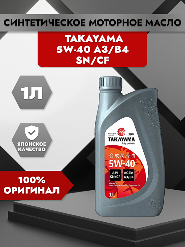 Синтетическое всесезонное моторное масло Takayama SAE 5W-40 API SN/СF. Разработано для использования в бензиновых двигателях легковых автомобилей, в том числе с турбонаддувом и системами нейтрализации отработавших газов. Подходит для применения в дизельных двигателях легких грузовиков. Высококачественные базовые масла и многофункциональный пакет присадок обеспечивает быстрый и легкий запуск двигателя при низких температурах, превосходную защиту двигателя от износа, увеличенный межсервисный интервал, предотвращает образование отложений. Гарантирует великолепную защиту двигателя даже при экстремальных режимах эксплуатации.