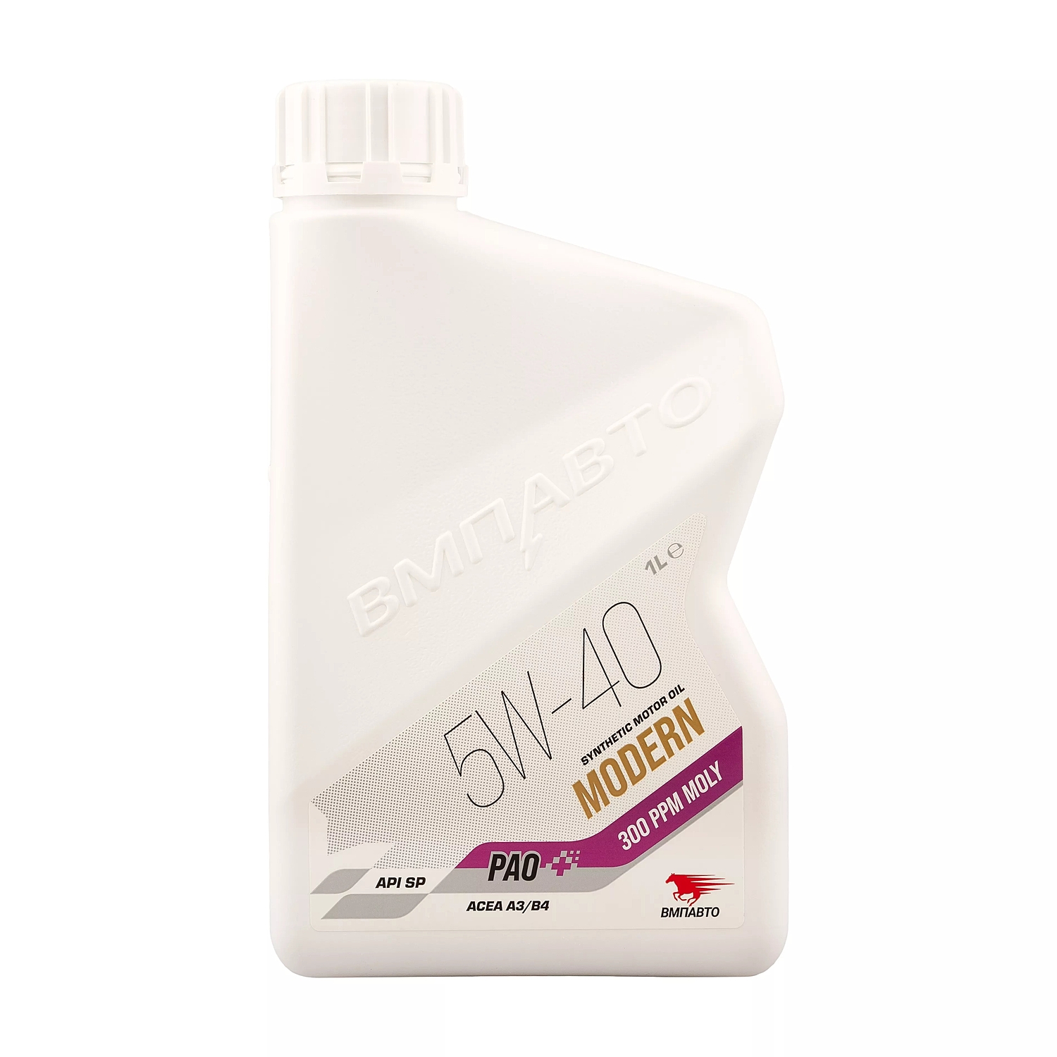 ВМПАвто Modern 5W-40 SP A3/B4 - синтетическое универсальное моторное масло на основе смеси полиальфаолефинов (PAO), высокоочищенного масла VHVI, алкилированных нафталинов (AN) и эфиров (Ester). Имеет в составе улучшенный пакет присадок, предназначенный для самых современных автомобилей и обеспечивающий максимальную энергоэффективность и высокий уровень защиты ДВС от износа. Преимущества: - Высокая защита двигателя от износа; - Снижает вероятность LSPI, предотвращает детонацию; - Улучшенные низкотемпературные свойства, обеспечивающие уверенный пуск зимой; - Устойчивость к старению и образованию отложений; - Низкий угар благодаря наличию алкилированных нафталинов (AN); - Совместимо с маслами других производителей с аналогичными допусками. Соответствует допускам автопроизводителей: API SP; ACEA A3/B4; VW 502.00, 505.00; RENAULT RN0700, RN0710; MB 229.3, MB 229.5; BMW LL-01; PSA B71 2296.