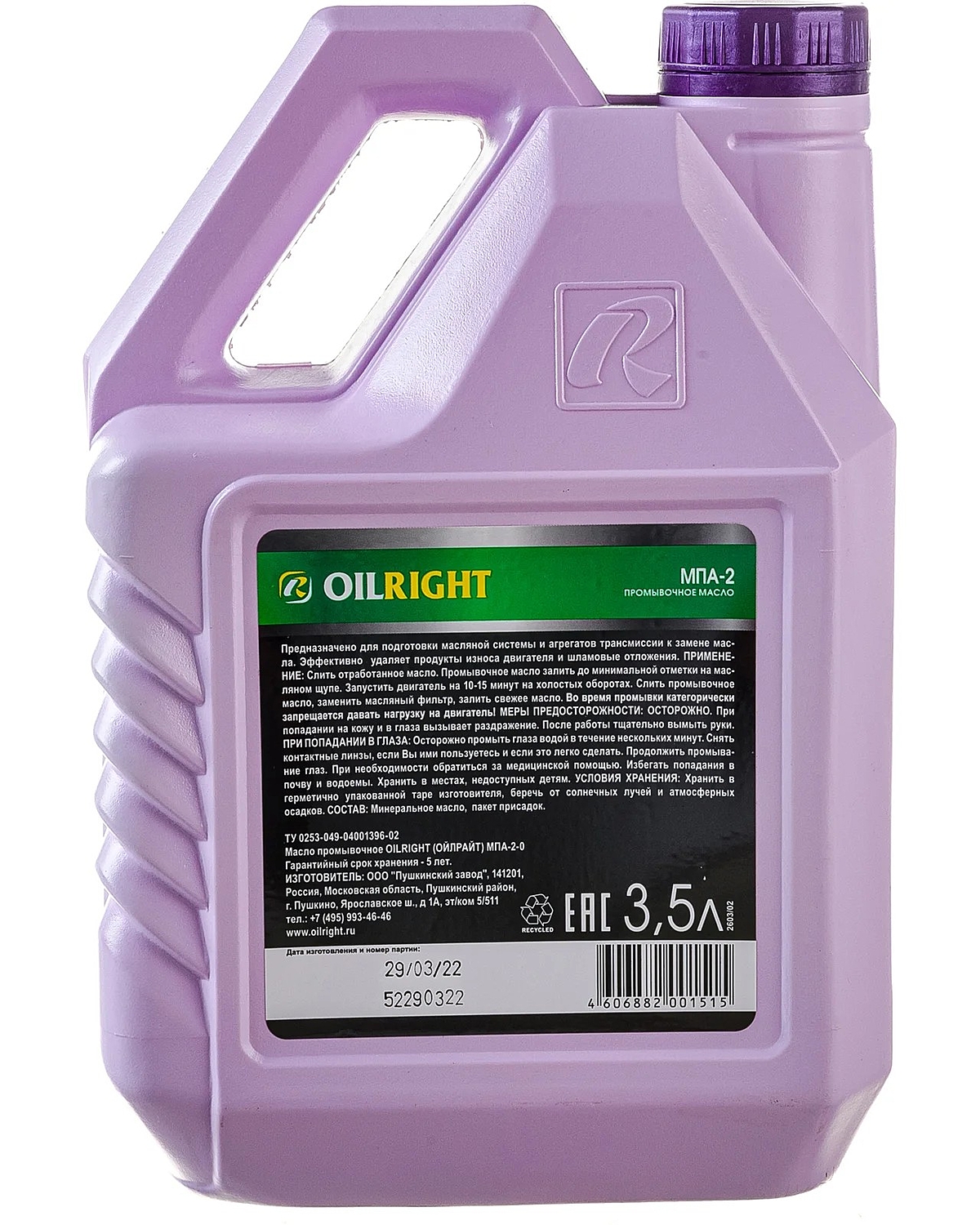 Oilright МПА-2 — минеральное промывочное масло для подготовки масляной системы и агрегатов трансмиссии к замене масла. Увеличивает ресурс двигателя и трансмиссии, сохраняя свойства масла, залитого после промывки, предотвращая его ускоренное окисление, вызванное остатками старого масла. Незаменимо при переходе на полусинтетическое и синтетические масла. Кинематическая вязкость (при 50°С): 80,-25,0.