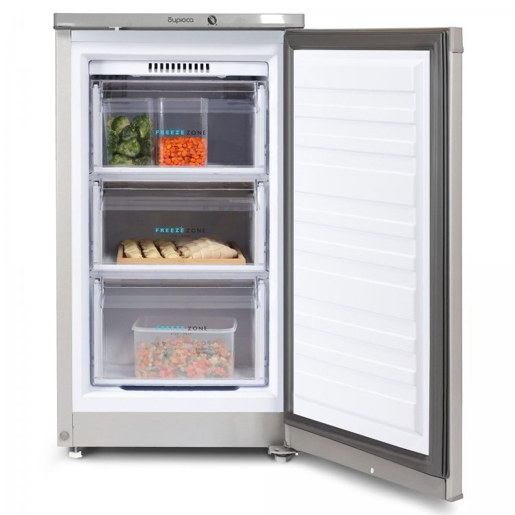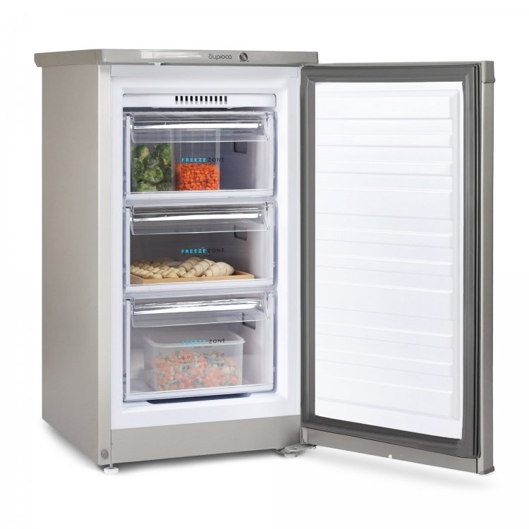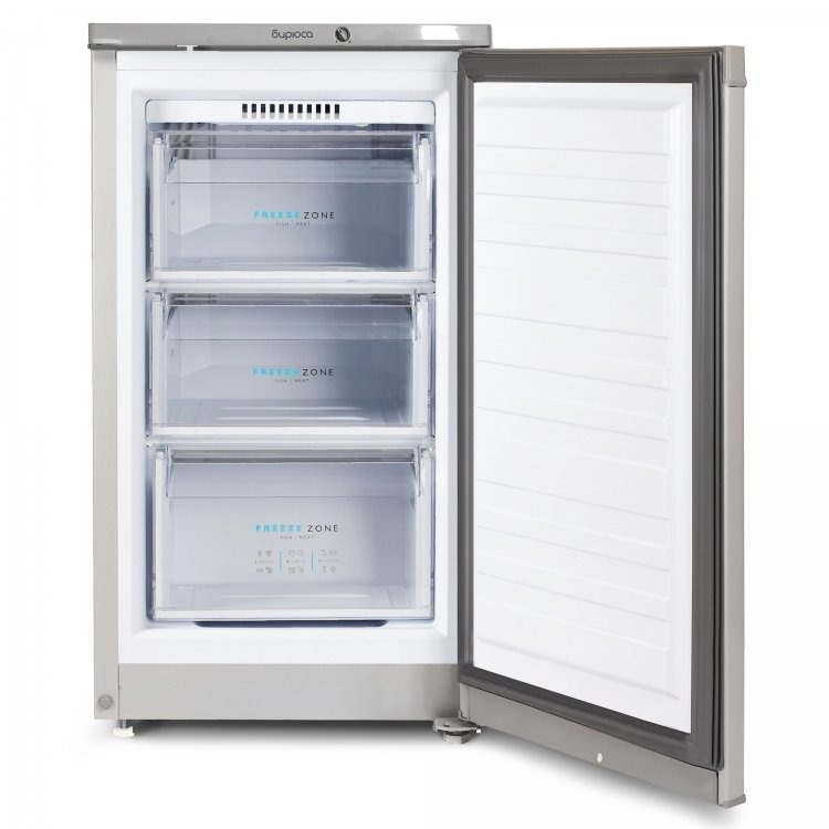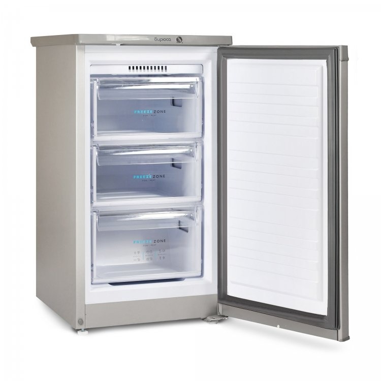 Бирюса M412 — компактная морозильная камера серебристого цвета с механическим управлением и режимом замораживания. Ее габариты составляют 87х48х60,5 см, а объем — 58 литров.