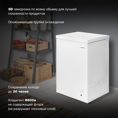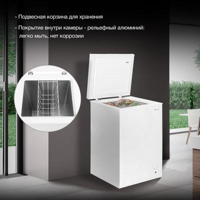 Тип-Морозильный ларь Тип управления-электромеханическое Полезный объем-99 л Потребляемая мощность-70 Вт Потребление энергии-357 кВт*ч/год Класс энергопотребления-A+ Климатический класс-N, SN, ST Мощность замораживания-4 кг/сут Система размораживания-ручная Хладагент-R600a Уровень шума-42 дБ