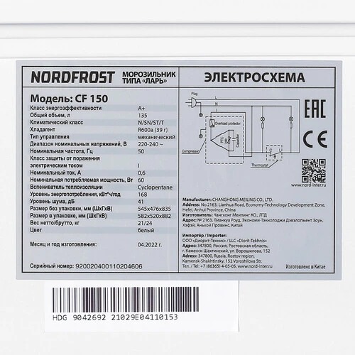 Компактный и неприхотливый при последующем уходе морозильный ларь Nordfrost CF150 понравится самым экономным пользователям, ведь максимальное потребление электричества не превышает показатель 168 кВтч/год. Внутри находится вместительная подвесная корзина, позволяющая расположить множество продуктов для длительного и правильного хранения.