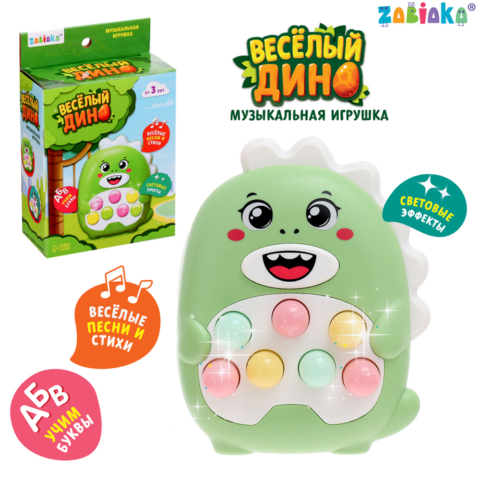 Музыкальная игрушка «Весёлый дино» привлечёт внимание трогательным дизайном и непременно порадует ребёнка. Забавный зверёк умеет петь и разговаривать.