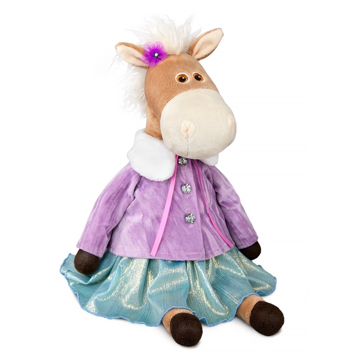 Элегантная лошадка Лаура Форд — это очаровательный персонаж, который станет любимым другом для вашей дочери или стильным аксессуаром в интерьере. Её мягкий бежевый мех и изысканный наряд создают уютную атмосферу, а удобный размер делает её идеальным спутником для игр дома или в качестве декора.