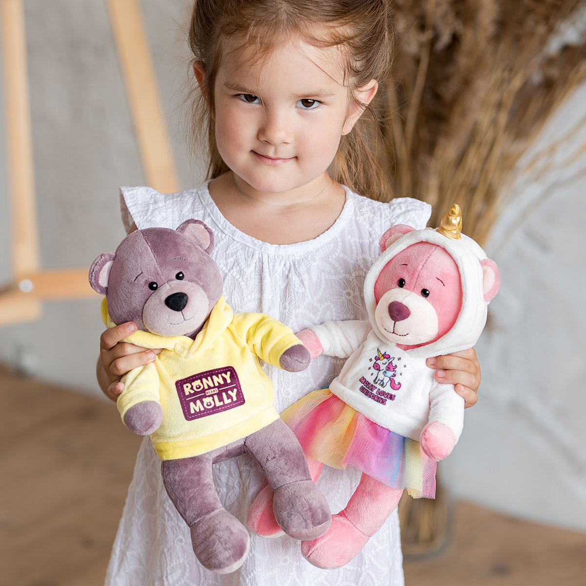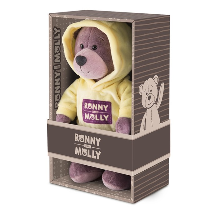 Мишка Ронни надел мягкую жёлтую толстовку. С её помощью он сообщает всем, кто его встречает, что они с Молли – друзья! И с Вами он с радостью подружится, если только Вы этого захотите, потому что Ронни со всеми старается найти общий язык – и с детьми, и со взрослыми! У Ронни много друзей, поэтому он многое знает и с любым желающим постарается держаться на одной волне, помогать находить общие темы с новыми знакомыми – например, общий интерес к мишкам или разговор о предпочтениях в одежде. А у самого Ронни есть и другие варианты образа! Ронни даже специально подготовил подарочную коробку, чтобы первый день знакомства был особенно ярким и праздничным!