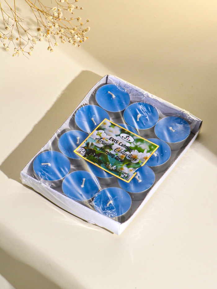 Набор из двенадцати голубых свечей в жестяных гильзах с ароматом утренней свежести. Идеальное решение для создания лёгкой и чистой атмосферы в доме. Компактный формат подходит для быстрого наполнения комнаты ароматом — достаточно четырёх часов горения.