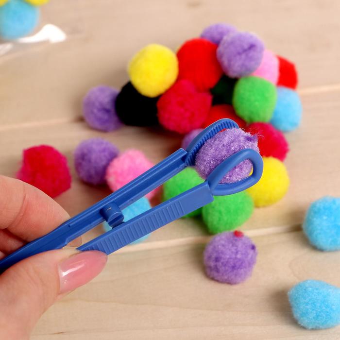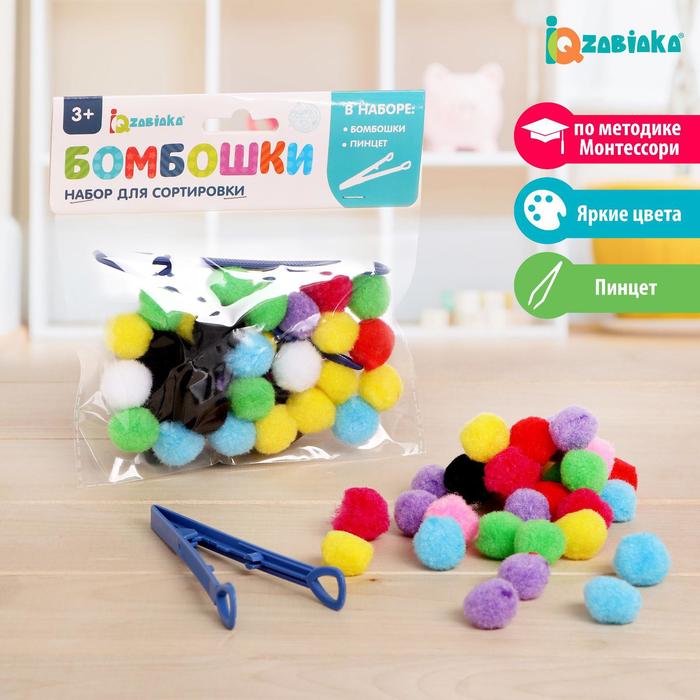 В комплект входят яркие шарики-бомбошки и пинцет для сортировки.