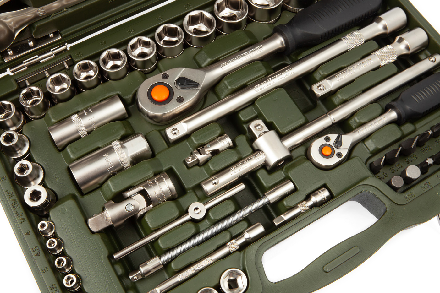 Набор инструментов 82 предметов в удобном чемодане подходит для ремонта автомобиля, мотоцикла и другой техники в гараже, мастерской, поездке или автопутешествии.