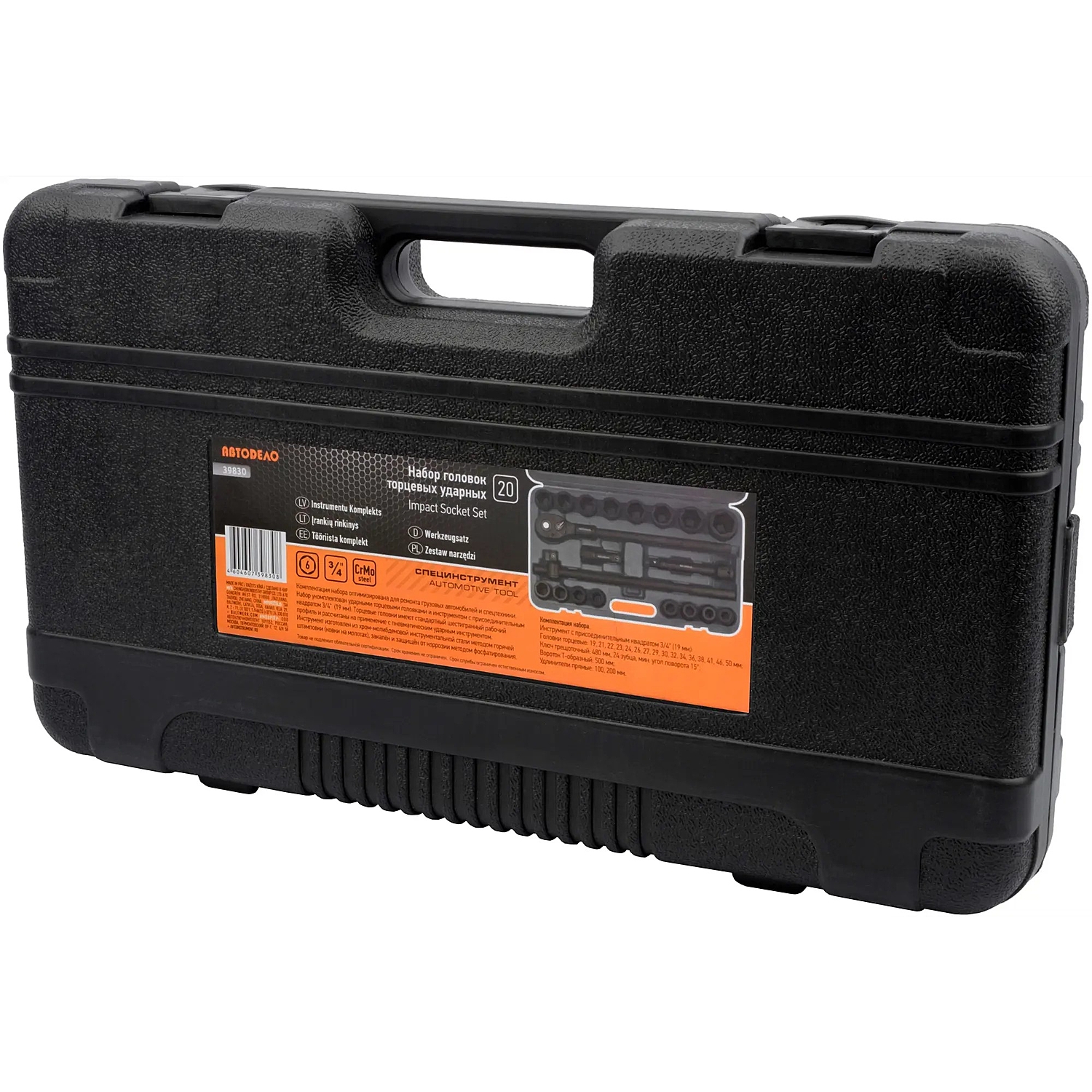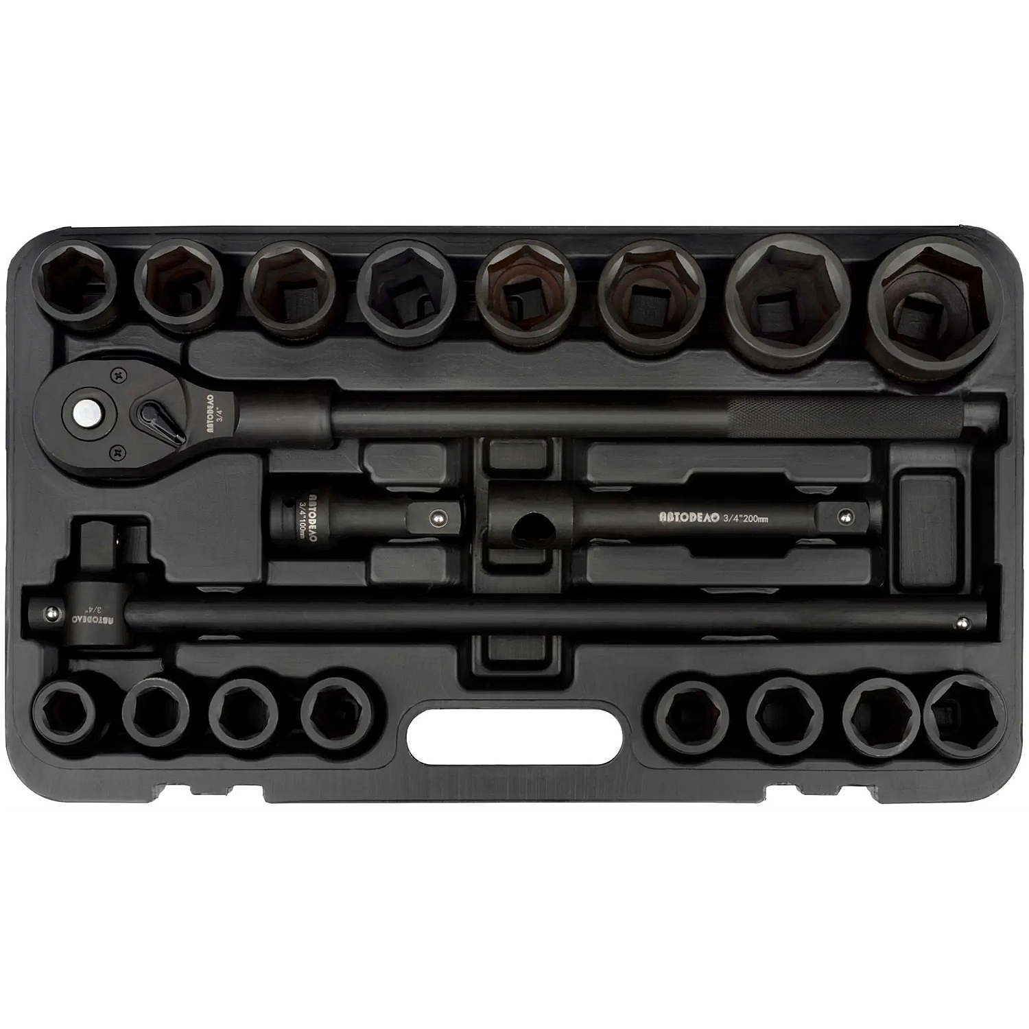 Набор укомплектован головками торцевыми и ключами с присоединительным квадратом 3/4". Торцевые головки имеют стандартный шестигранный рабочий профиль и рассчитаны на применение с пневматическим ударным инструментом.