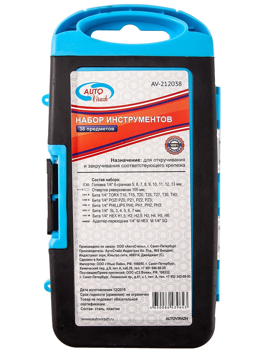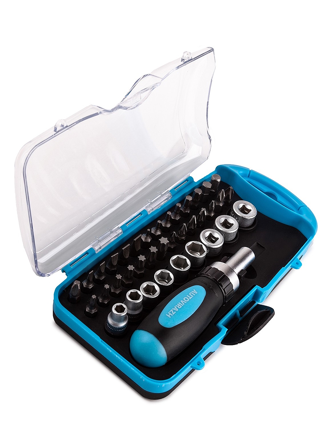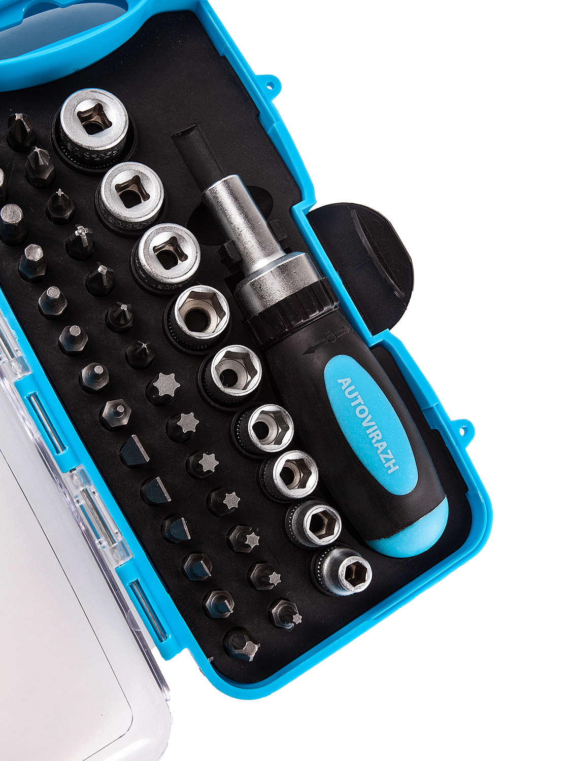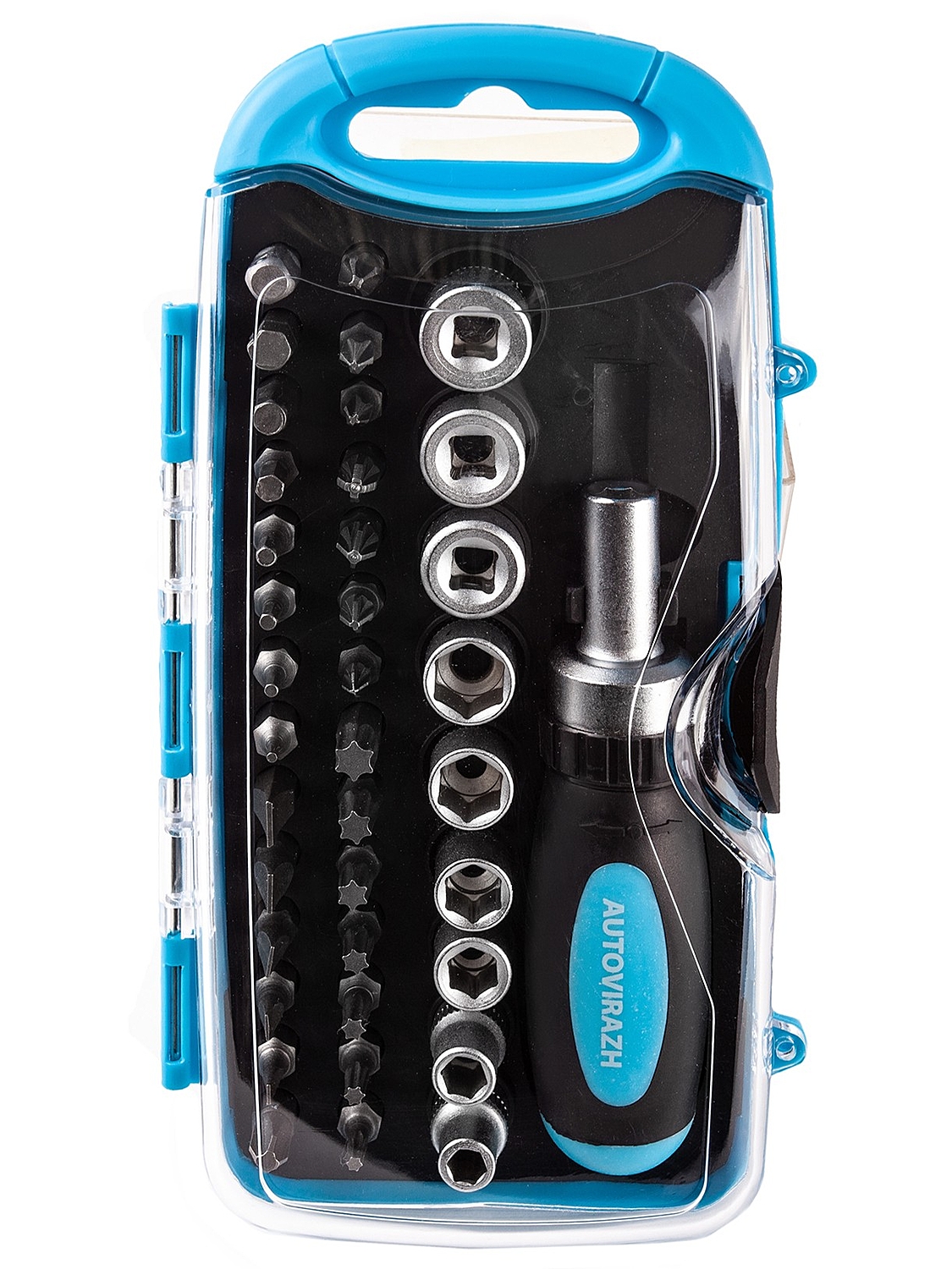 Набор инструмента Autovirazh AV-212038 представляет собой компактный комплект оборудования для базовой работы с крепежом различного типа. Инструменты уложены в пластиковый кейс с полупрозрачной крышкой, которая облегчает поиск подходящего предмета.
