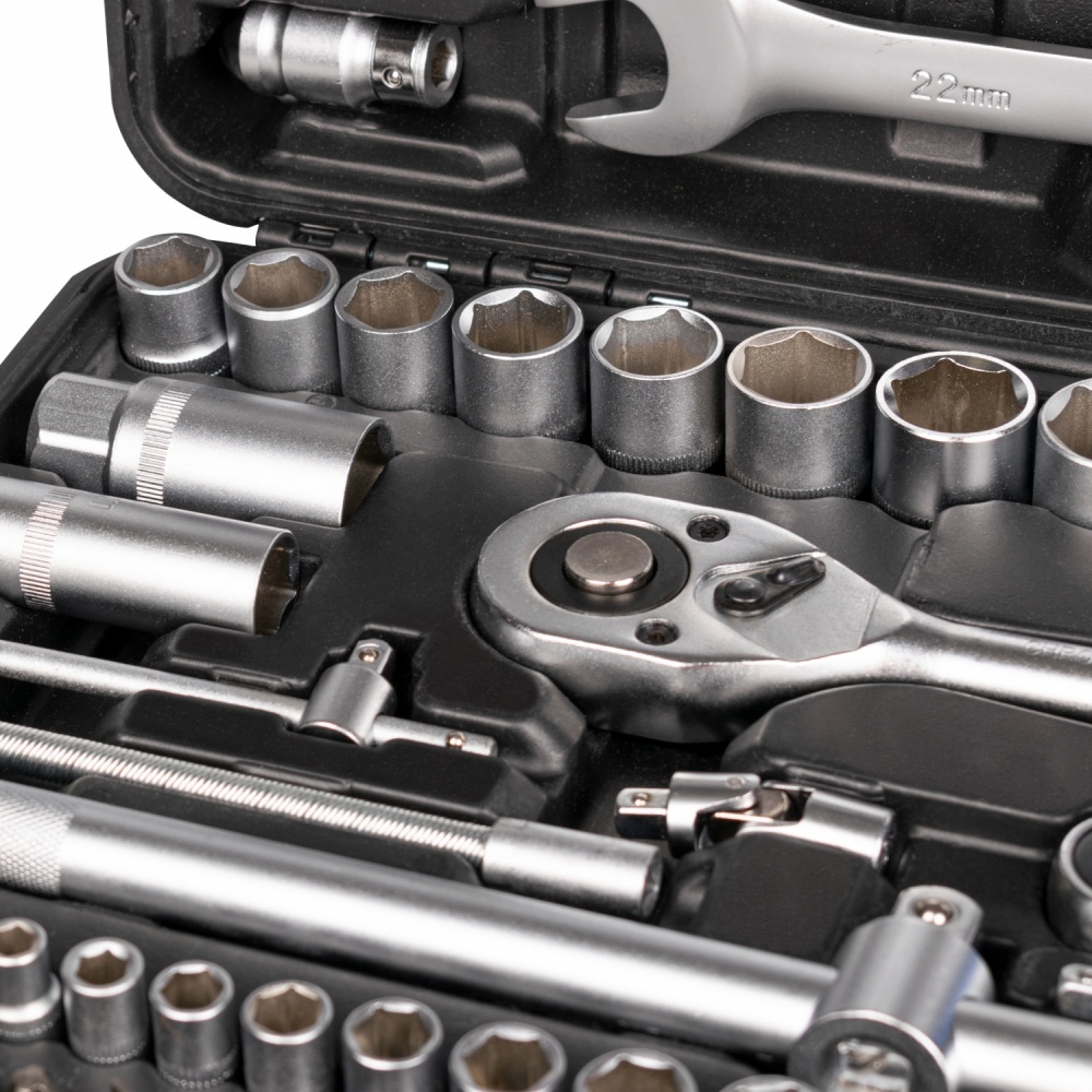 Все компоненты набора изготовлены из высокопрочной закаленной углеродистой стали, имеют матовое хромированное покрытие, благодаря чему отличаются высокой прочностью и долговечностью. Трещотки оснащены храповым механизмом на 45 зубцов и имеют двухкомпонентные эргономичные рукояти.