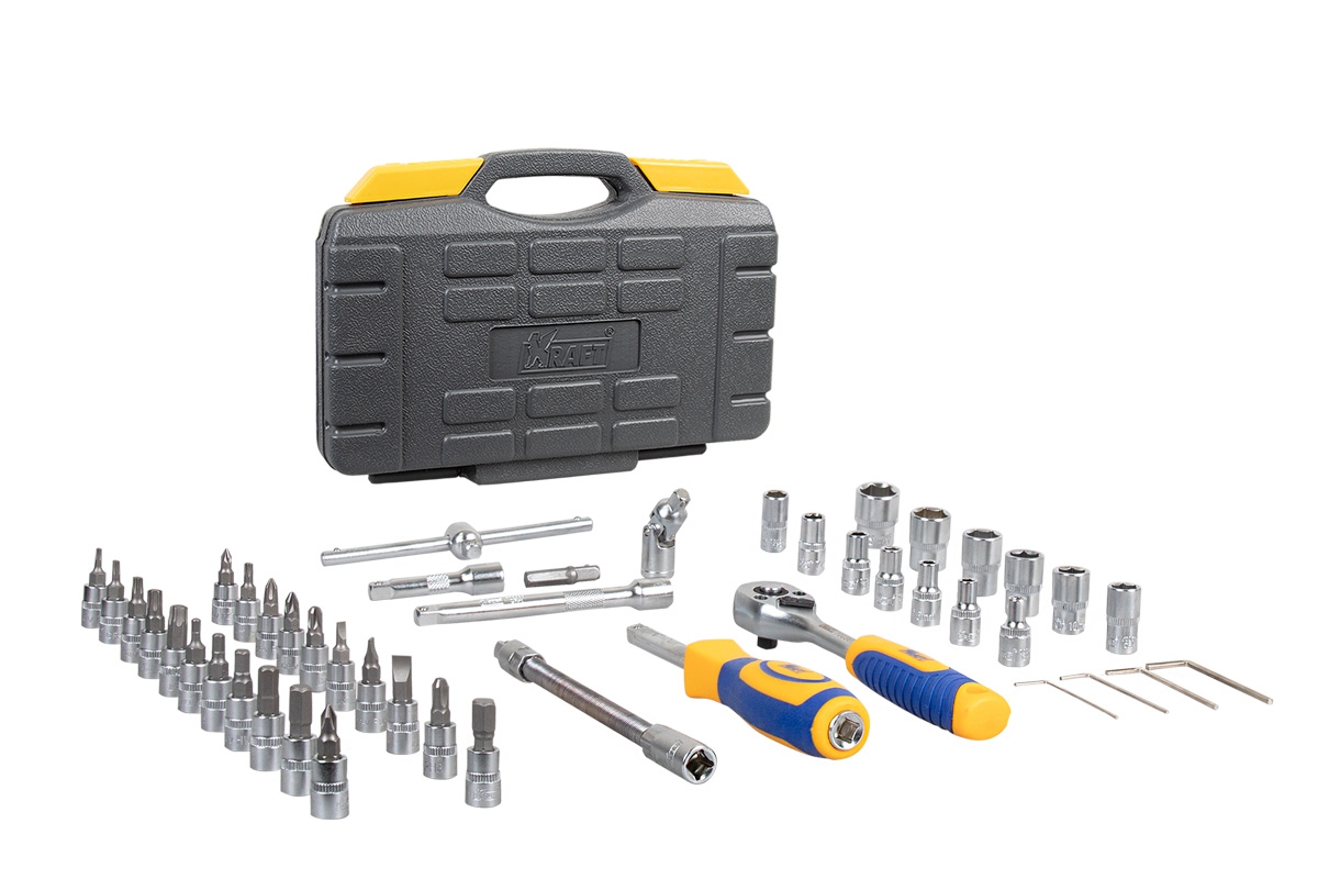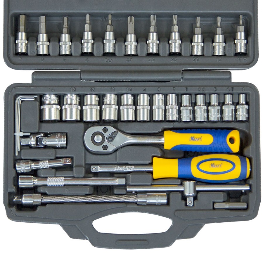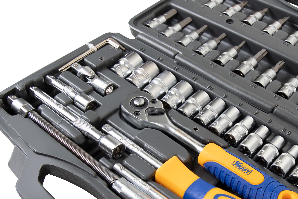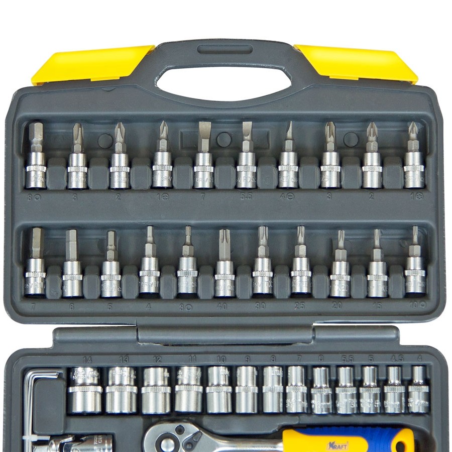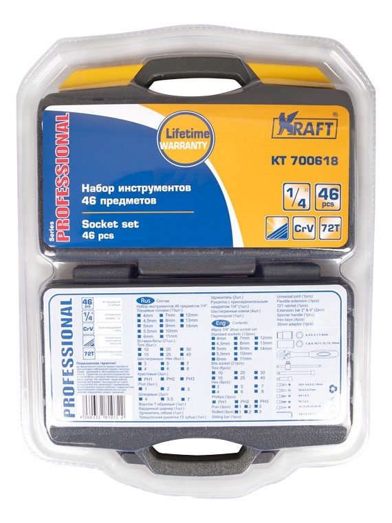 Набор инструмента Kraft KT-700618 позволяет производить обслуживание резьбовых соединений в диапазоне размеров от 4 до 14 мм. Это полнофункциональный набор торцевых головок и принадлежностей для работы с приводом 1/4''Dr.(6,35мм).