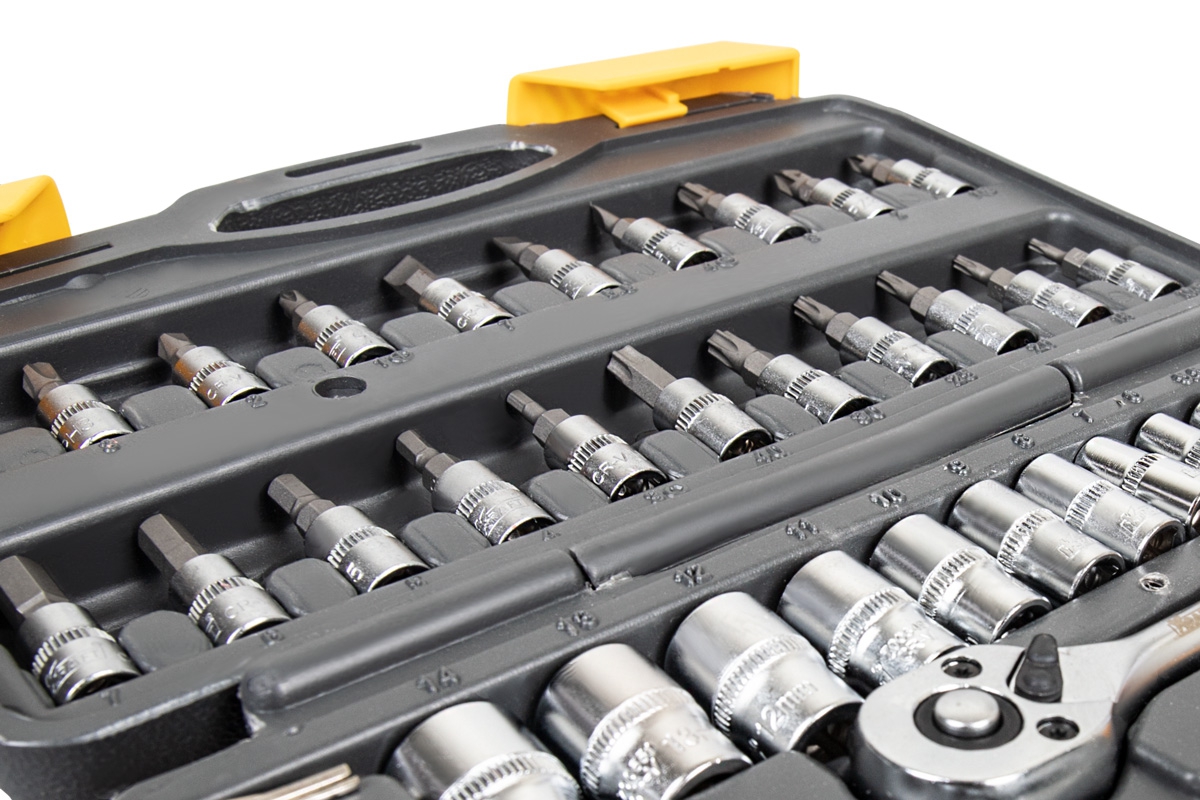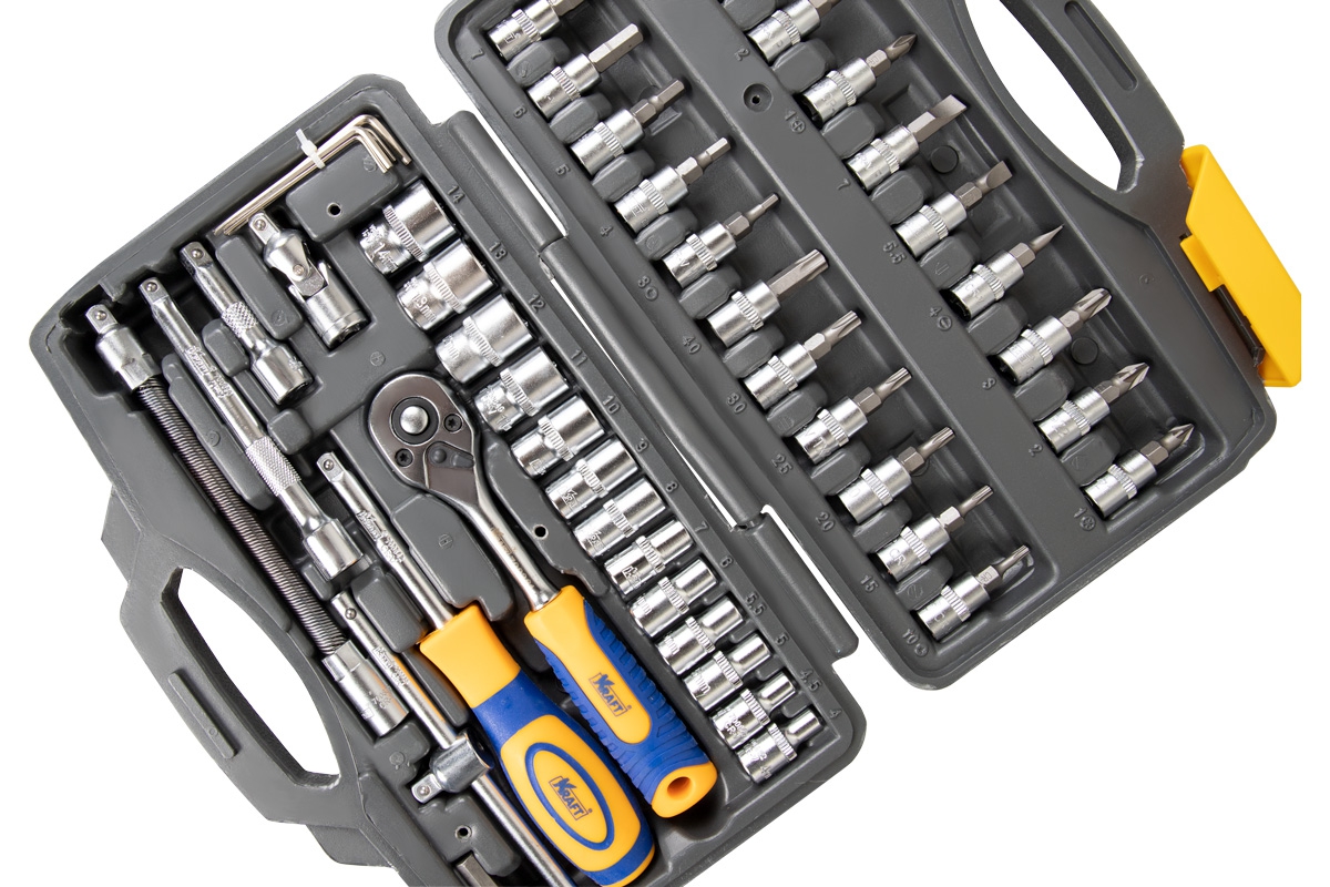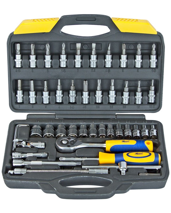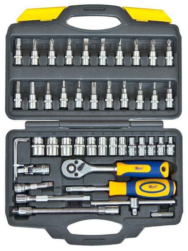 Набор инструмента Kraft KT-700618 позволяет производить обслуживание резьбовых соединений в диапазоне размеров от 4 до 14 мм. Это полнофункциональный набор торцевых головок и принадлежностей для работы с приводом 1/4''Dr.(6,35мм).