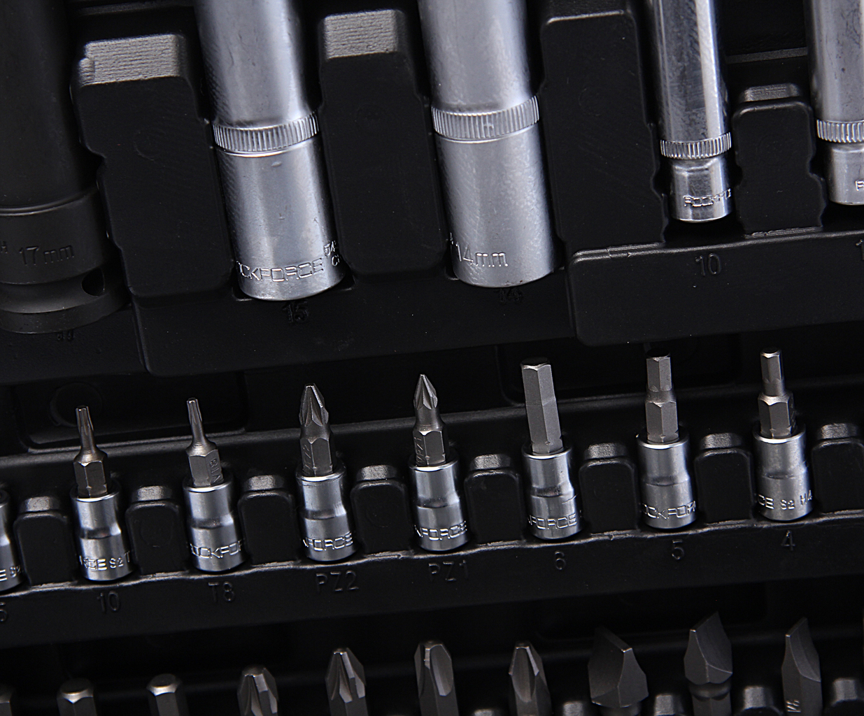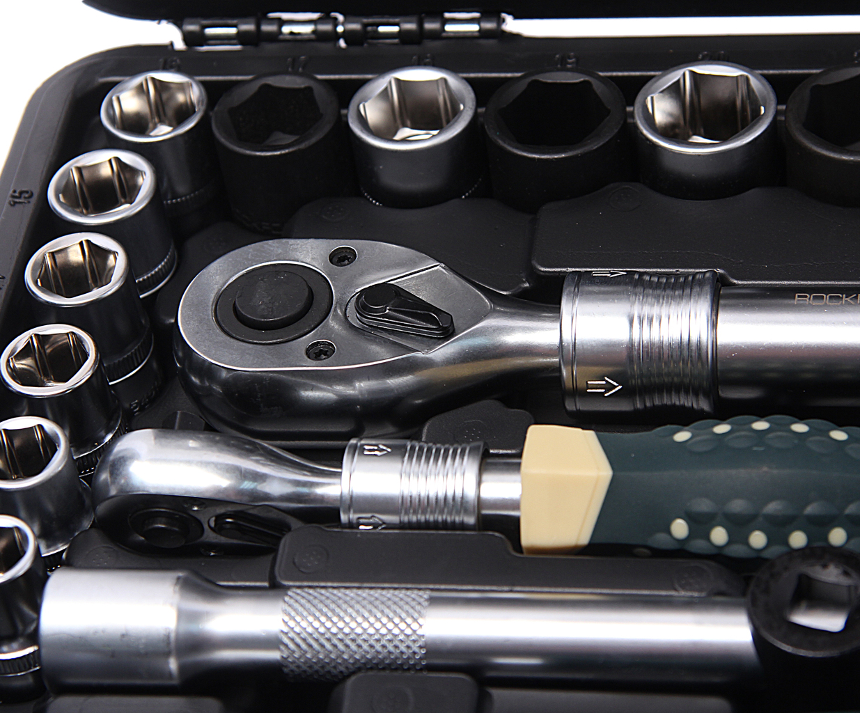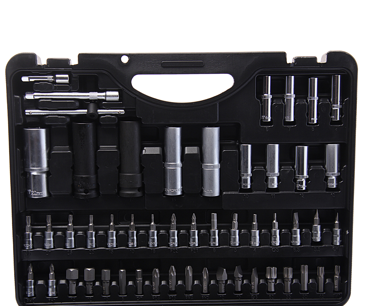 Комплектация включает в себя широкий спектр головок и бит различных размеров, удлинители, карданный шарнир, трещотку, рукоятку, вороток Т-образный и многое другое.