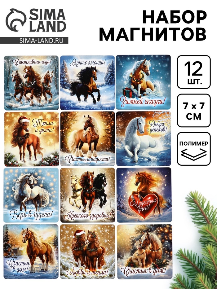 Набор магнитов полимер новогодних «Милые Лошадки» 7×7 см 12 шт.