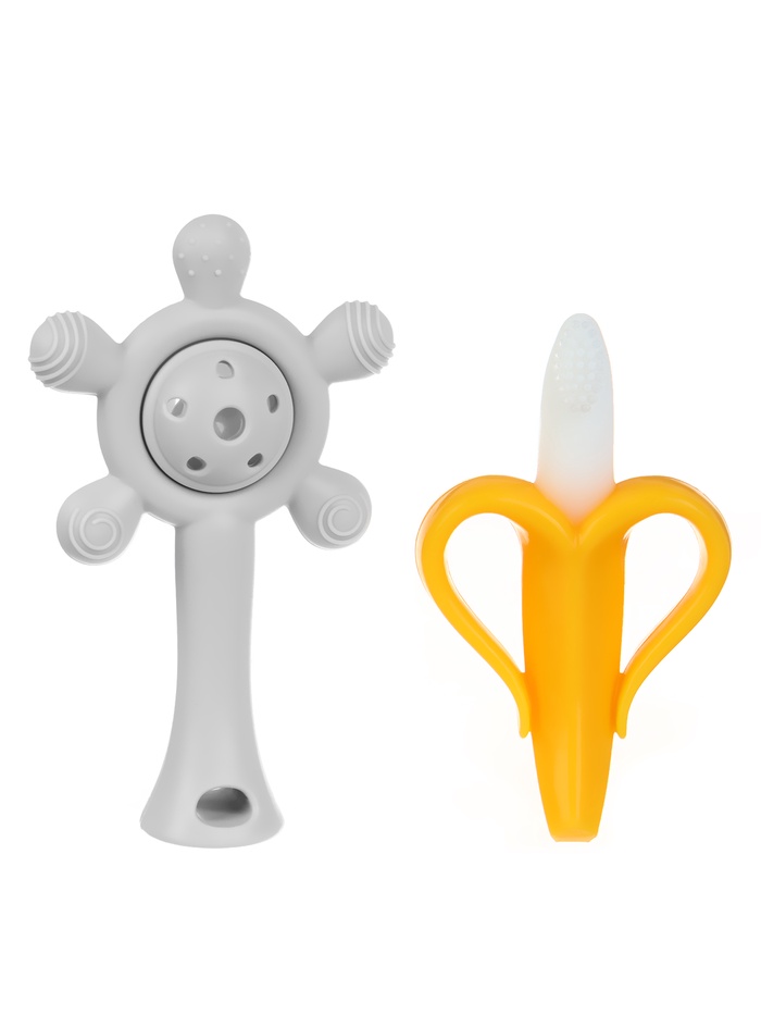 Прорезыватели силиконовые для зубов «Банан и погремушка» — практичный набор для малышей от 3 месяцев. Мягкий силикон бережно массирует дёсны, облегчая дискомфорт при прорезывании зубов, а яркие цвета и погремушка удерживают внимание ребёнка.