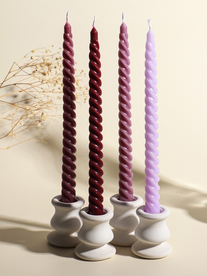 Этот набор витых свечей создаёт атмосферу уюта и спокойного торжества. Четыре высокие свечи насыщенного бордового оттенка стаятся в интерьере и при горении. Их плавные линии и глубина цвета придают пространству динамику и художественную завершённость.