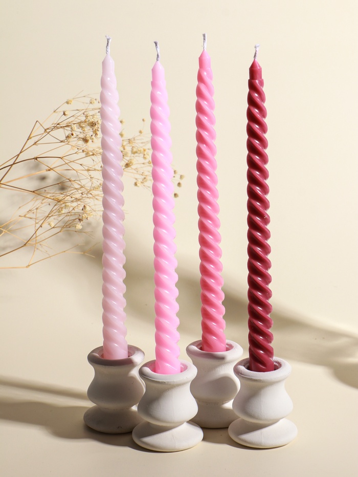 Этот набор из четырёх высоких витых свечей — готовое элегантное решение для создания уютной атмосферы. Их стройный силуэт и нежный розовый оттенок придают интерьеру особый шарм и теплоту.
