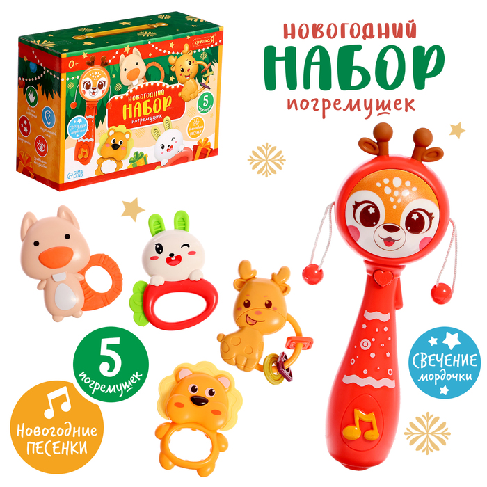 Новогодний набор погремушек с русской озвучкой и световыми эффектами станет идеальным подарком для малышей с первых дней жизни. Этот яркий комплект из 5 разноцветных погремушек поможет создать атмосферу праздника и увлечь ребёнка игрой, которая будет полезной и безопасной.