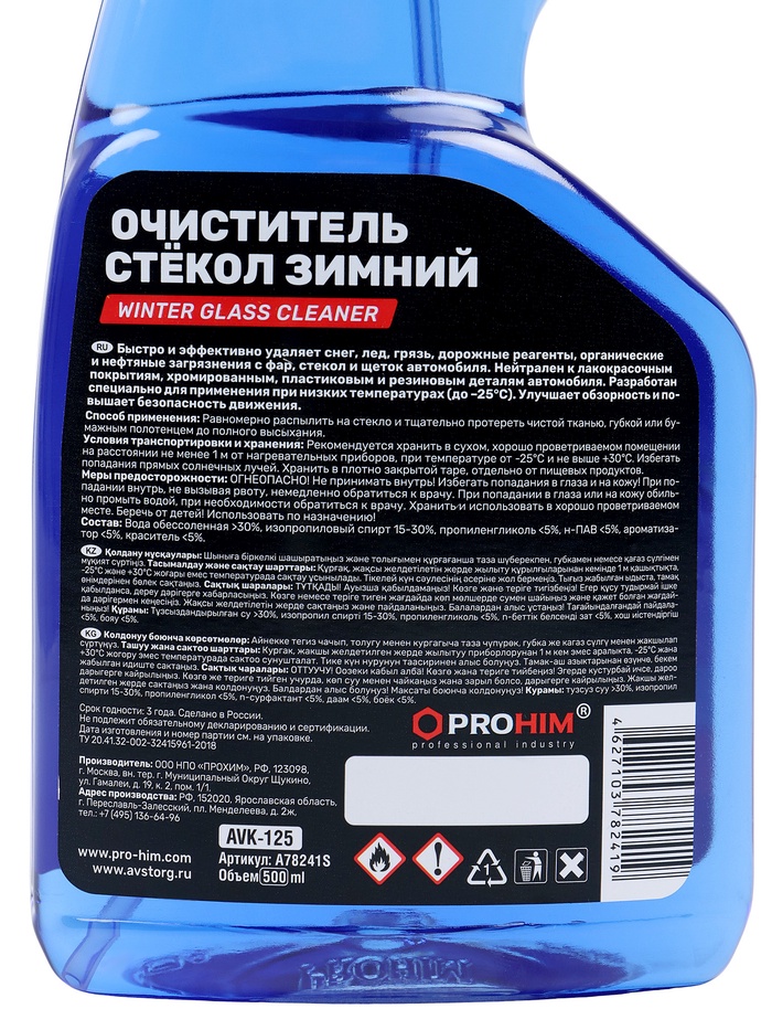 Зимний очиститель стёкол AVS AVK-125 - это эффективное средство для быстрого удаления наледи, инея, грязи и дорожных реагентов с поверхности автомобильных стёкол. Объём 500 мл и удобный распылитель-триггер делают его простым в применении и экономичным в расходе. Средство обеспечивает чистое и прозрачное стекло даже при низких температурах, улучшая обзор и повышая безопасность движения в зимний период. Формула специально разработана для эксплуатации при отрицательных температурах, не оставляет разводов и не повреждает поверхности.
