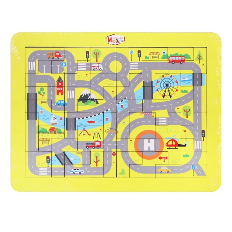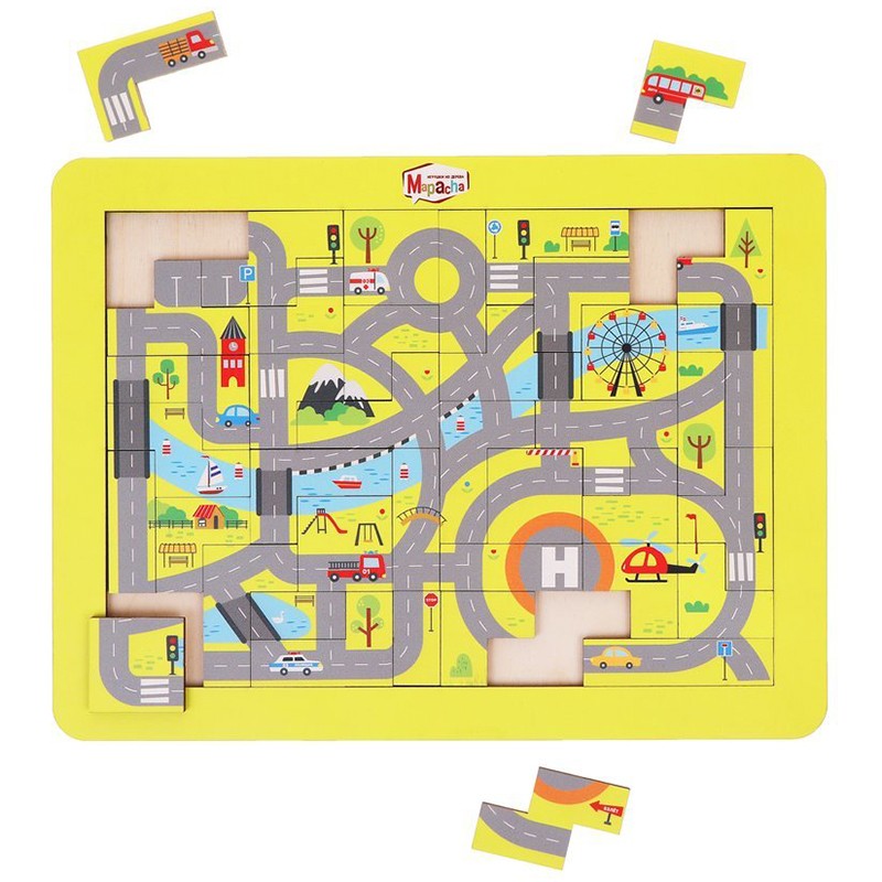 Деревянный пазл «Автодорога» развивает внимание, память и мелкую моторику. Задача игры – собрать из деталей картинку с автодорогой, транспортными средствами, дорожными знаками и другими интересными предметами. Собрав пазл полностью, ребенок может пофантазировать и придумать разные маршруты для машин и автобуса!
