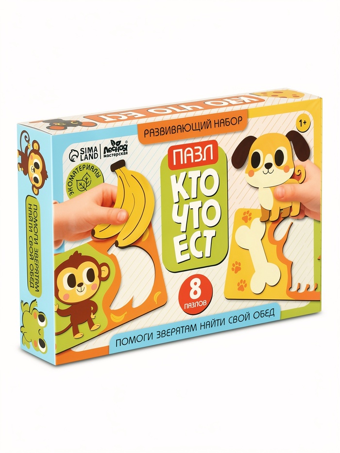 Развитие через игру: детские пазлы с крупными элементами формируют мелкую моторику, координацию движений и образное мышление. Ребёнок учится доводить начатое до конца и радоваться собранной картинке. «Кто что ест?» — это спокойная обучающая игра для мальчиков и девочек от 1 года, где каждый элемент становится шагом к новым навыкам и уверенности в собственных силах.