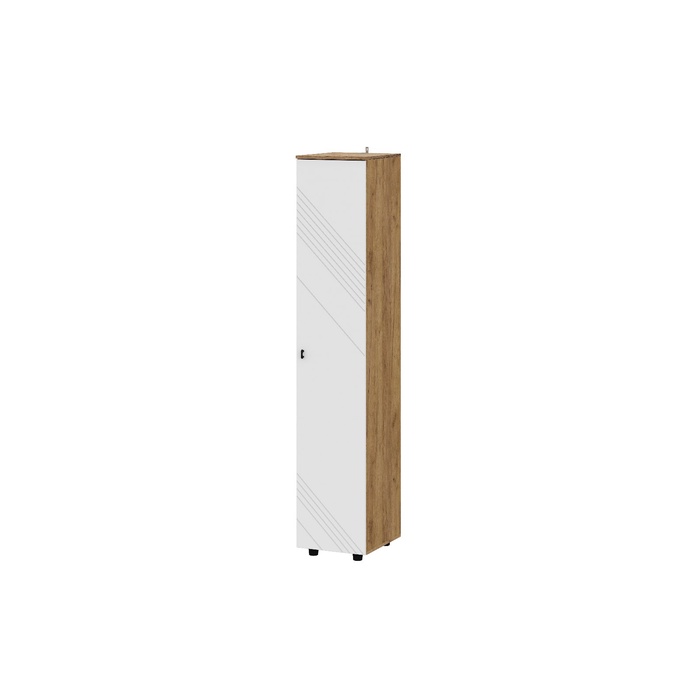 Светлое и функциональное решение для хранения в любом помещении — от кухни до прихожей или спальни. Узкий шкаф-пенал выполнен в гармоничном сочетании оттенков: чистый белый и тёплая текстура золотого дуба создают уютный и элегантный образ. Декоративная фрезеровка на фасаде добавляет изысканности и визуального интереса.
