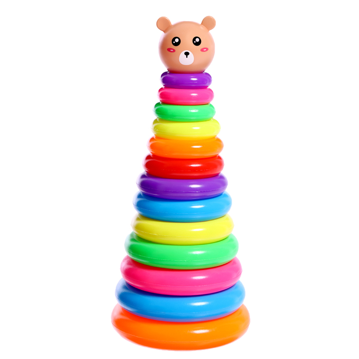 Пирамидка «Мишутка» — яркая игрушка для малышей, которая помогает учиться собирать детали по размеру и цвету. Кольца удобно держать в руках, они надеваются на стержень и складываются в высокую башню с фигуркой медвежонка сверху.