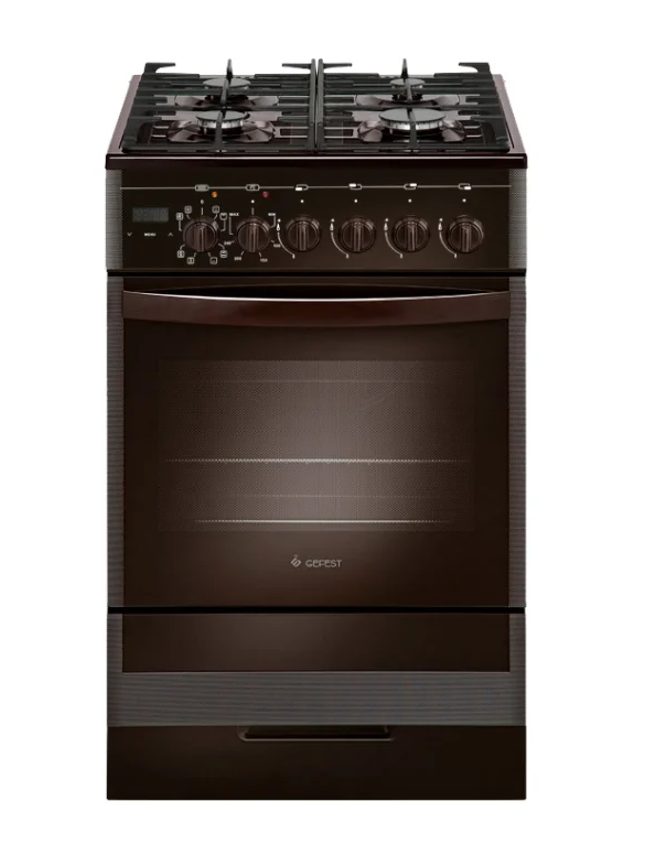 Плита Gefest 5502-03 0045 имеет стильный темно-коричневый цвет. Для управления плитой используется привычный многим пользователям кухонной техники поворотный механизм. На передней панели есть дисплей, который не только используется для функционирования таймера, но и играет роль часов. Плита Gefest 5502-03 0045 имеет в своем арсенале 4 конфорки и 55-литровую духовку, объема которой достаточно для приготовления любых блюд. Варочная панель имеет электроподжиг: вам не придется пользоваться спичками или зажигалками. Активация электроподжига происходит при повороте ручки управления. Есть и газ-контроль конфорок: если пламя погаснет, то подача газа прекратится.