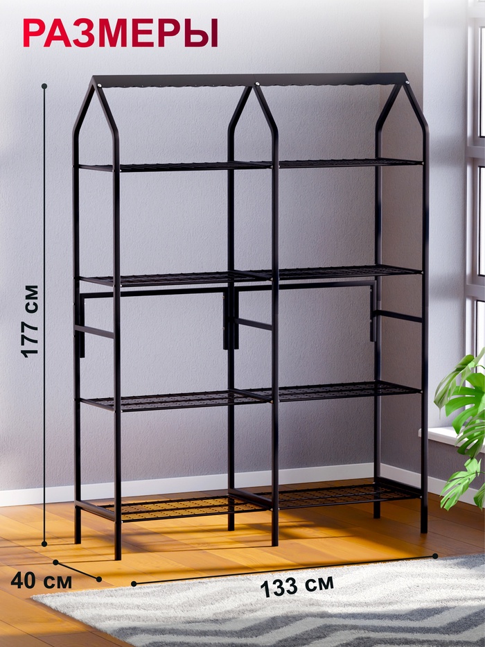 Металлическая подставка для цветов 133×40×177 см — напольный стеллаж для размещения комнатных растений в квартире, доме или на балконе. Конструкция с двумя секциями помогает организовать зелёный уголок и рационально использовать вертикальное пространство.