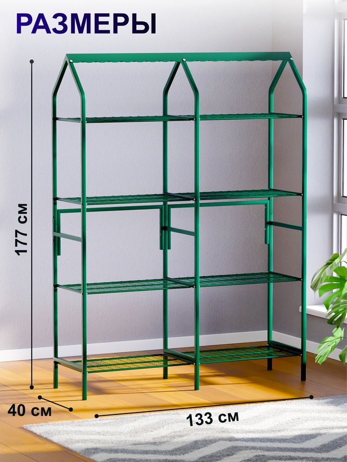 Зелёная металлическая подставка для цветов — функциональное решение для домашнего садоводства. Конструкция включает две секции и восемь полок.