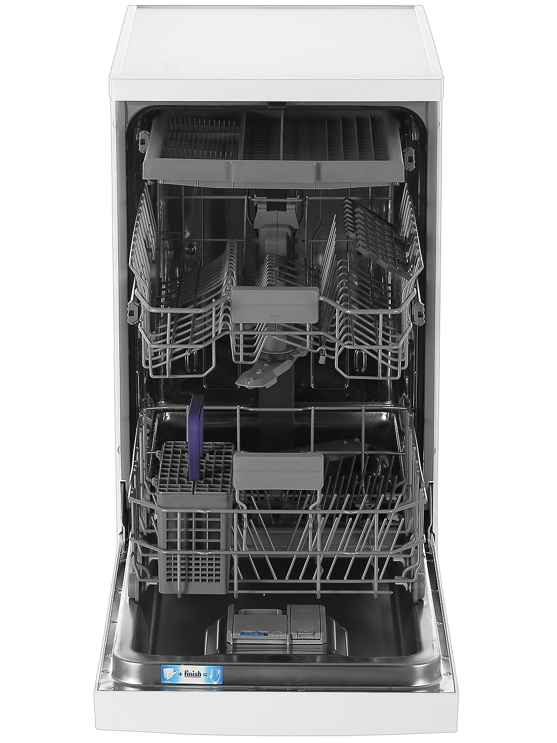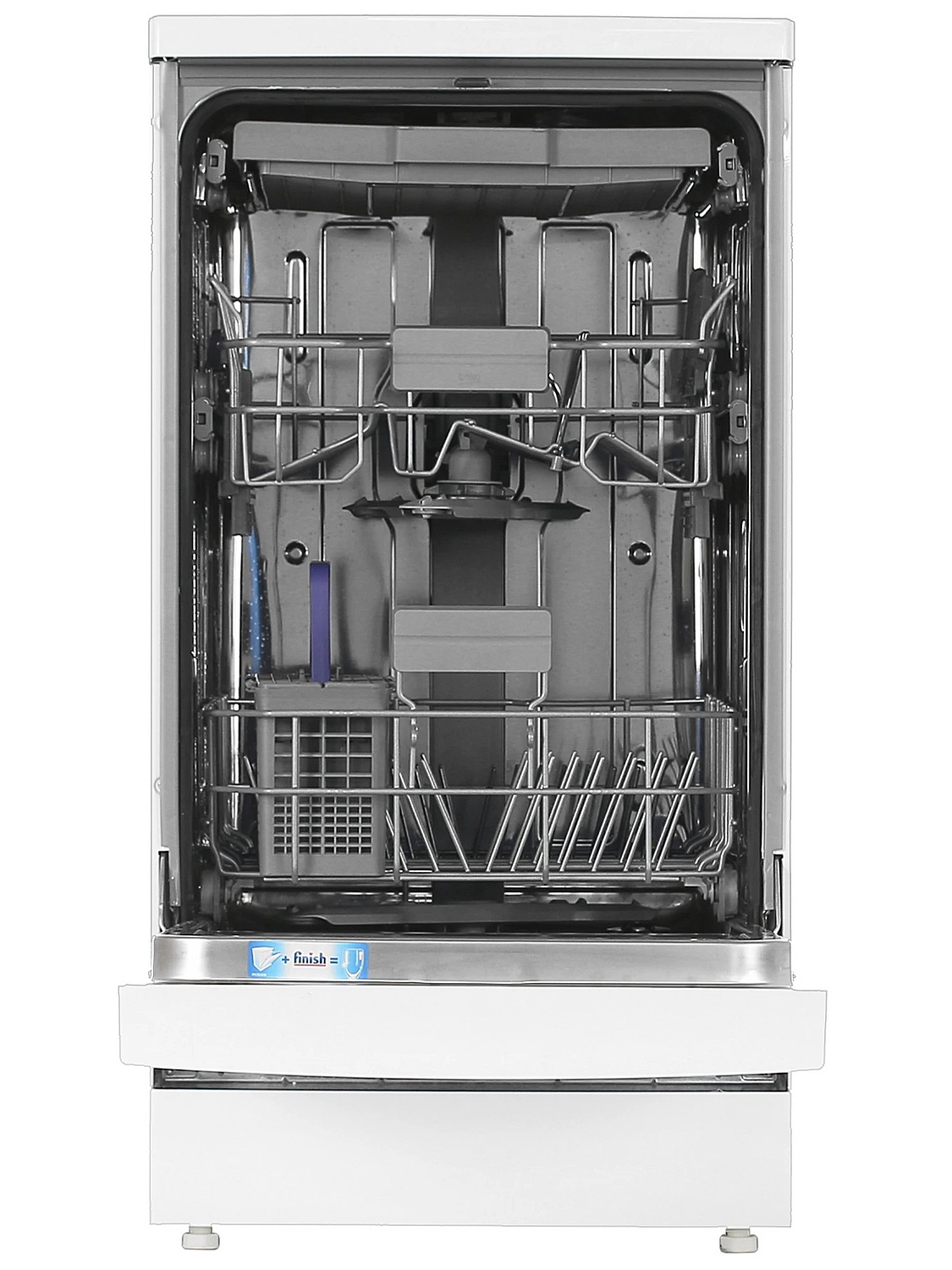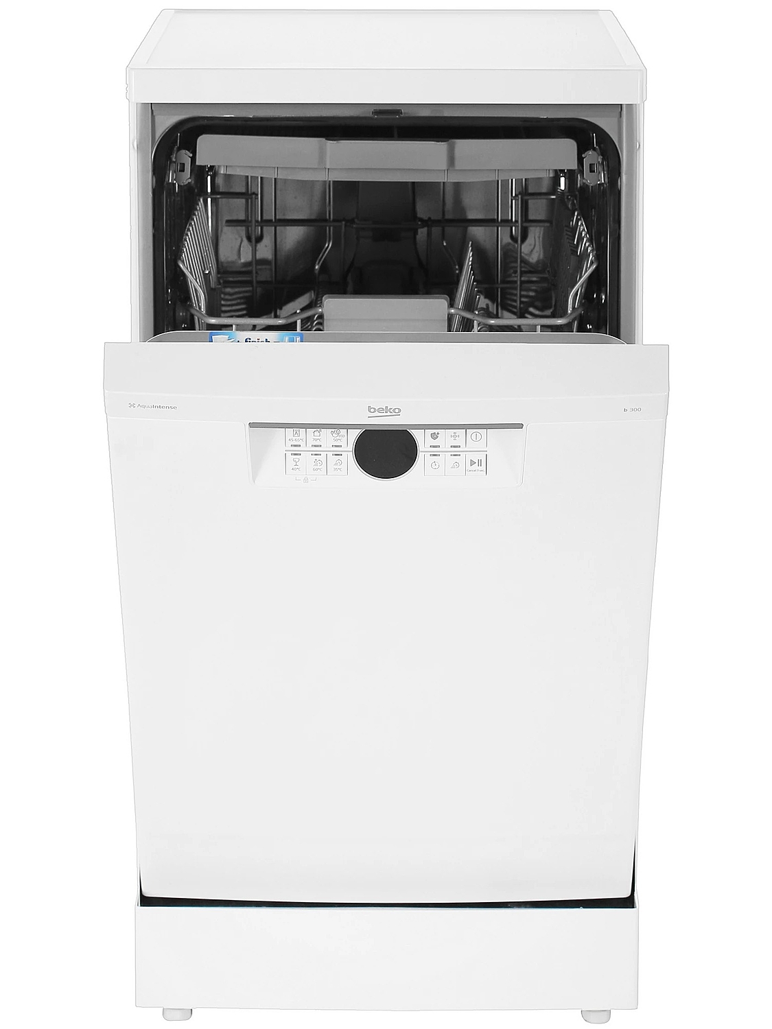 Нижняя корзина машины оснащена дополнительным разбрызгивателем AquaiIntense, позволяющим справляться даже с самыми стойкими загрязнениями. Полки верхней корзины — регулируемые.
