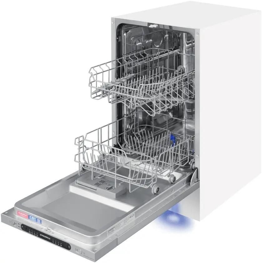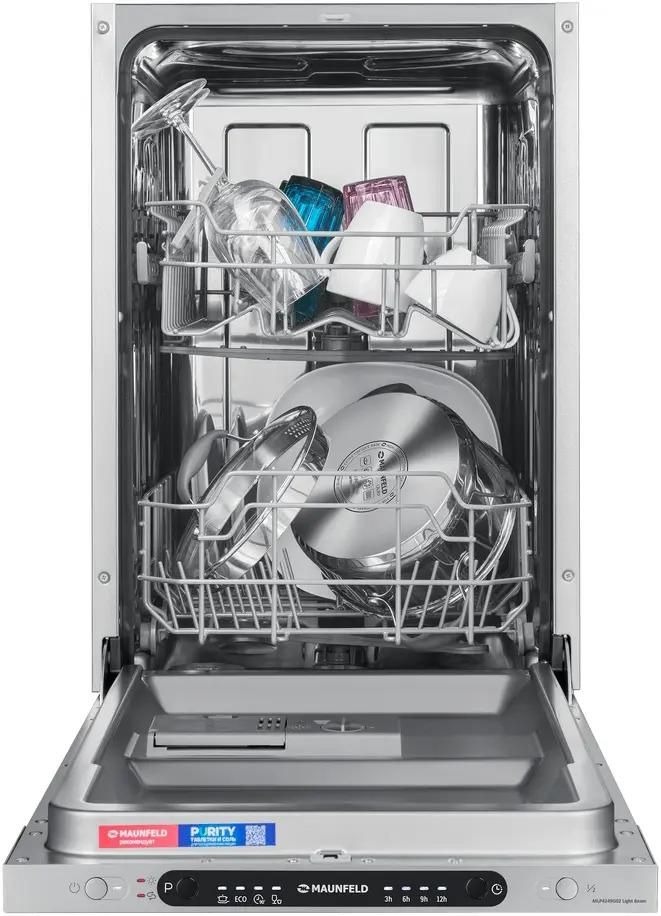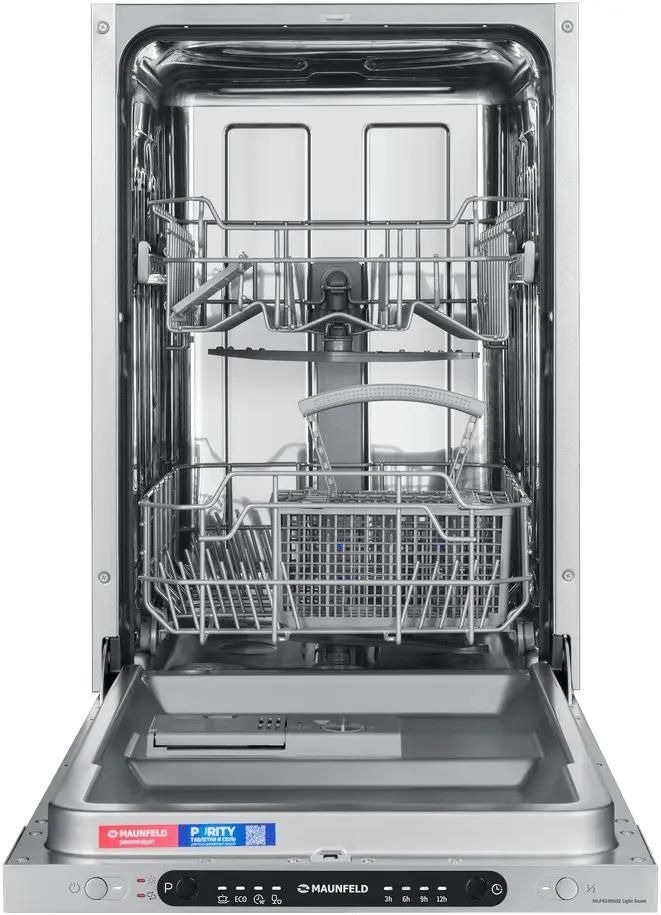 Узкая посудомоечная машина MAUNFELD MLP4249G02 Light Beam подойдёт для компактной кухни. Она избавит вас от необходимости мыть посуду вручную. Машина узкая, но весьма вместительная, в неё можно загрузить до 9 комплектов посуды. Удобный индикатор луч на полу - приятное дополнение к основным функциям.
