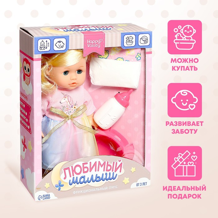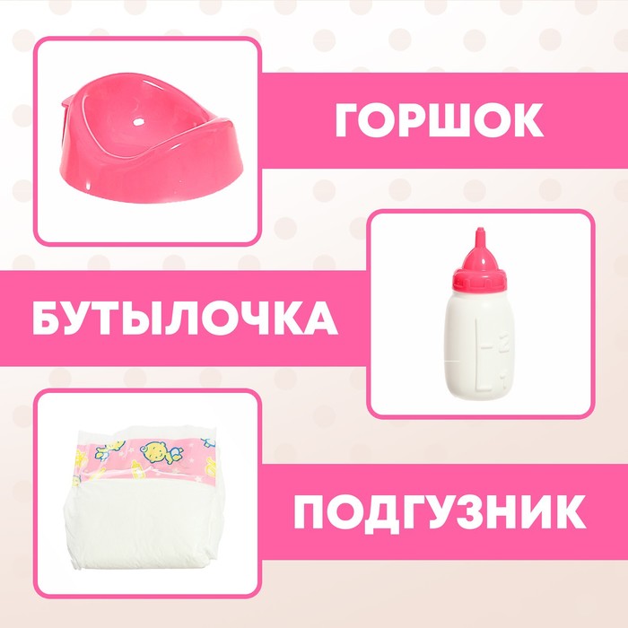 • В комплект входит бутылочка, подгузник и горшок. С этими аксессуарами ребёнок придумает множество весёлых игр.